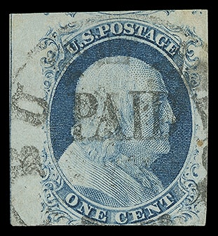 type IV. Large margins except barely in at top, neat face-free "Balt. Paid" double-circle cancel; minor corner creases at top, F.-V.F. appearance. Scott No. 9; $100.