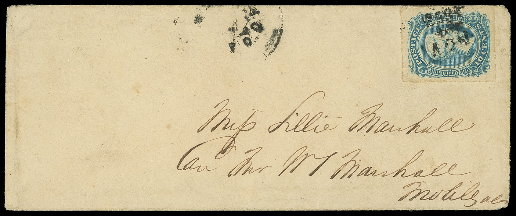 688     11 image1863, 10¢ blue. Large margins, tied by blue "Ashboro N.C., Jun 7" cds on homemade cover with military address to Lt. Col. A.C. McAlister, 46th Ret. N.C.I., Cooke's Brig., Richmond Va.; some ink offset and ton spot at left, F.-V.F.