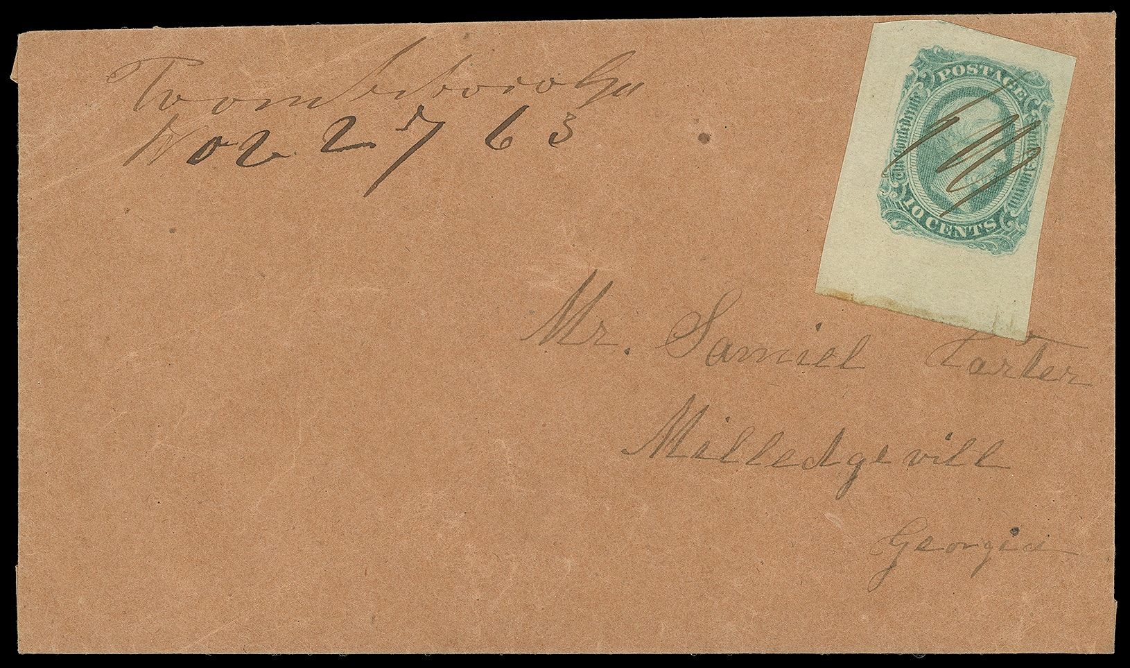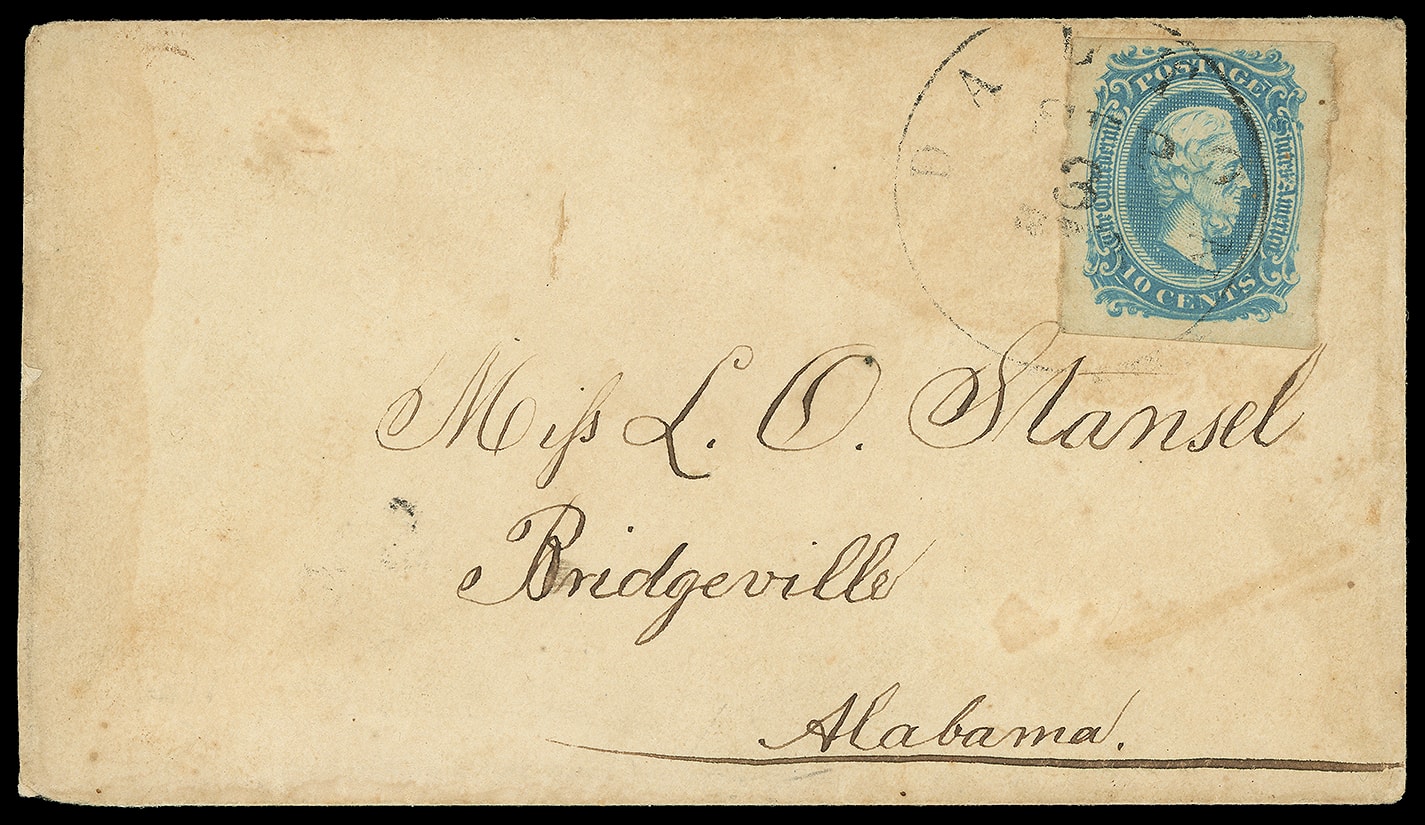687     11 image1863, 10¢ blue. Four margins, pen canceled, partial blue "Auburn Ala. 25" cds on homemade brown cover with military address to Col. James E. Saunders, Care of Brig. Genl. P.D. Roddey, Courtland, Lawrence Co., Ala., docketed "D.H. Sunders, Answered." at left; flap flaws, F.-V.F., ex-Ballard.