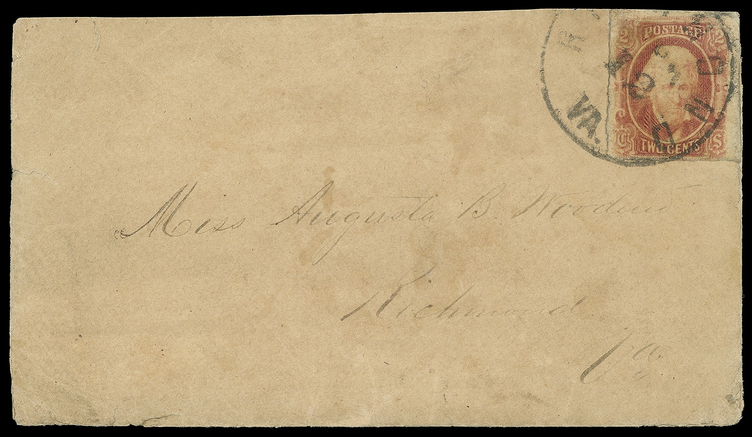 681     8 image1863, 2¢ brown red. Margins to touched at bottom, tied by "Richmond Va." cds on drop cover to Miss Augusta Woodward, appropriately prepaid cover at the 2¢ drop rate; cover and stamp flaws, no flap, Fine appearance, signed Kaufmann.