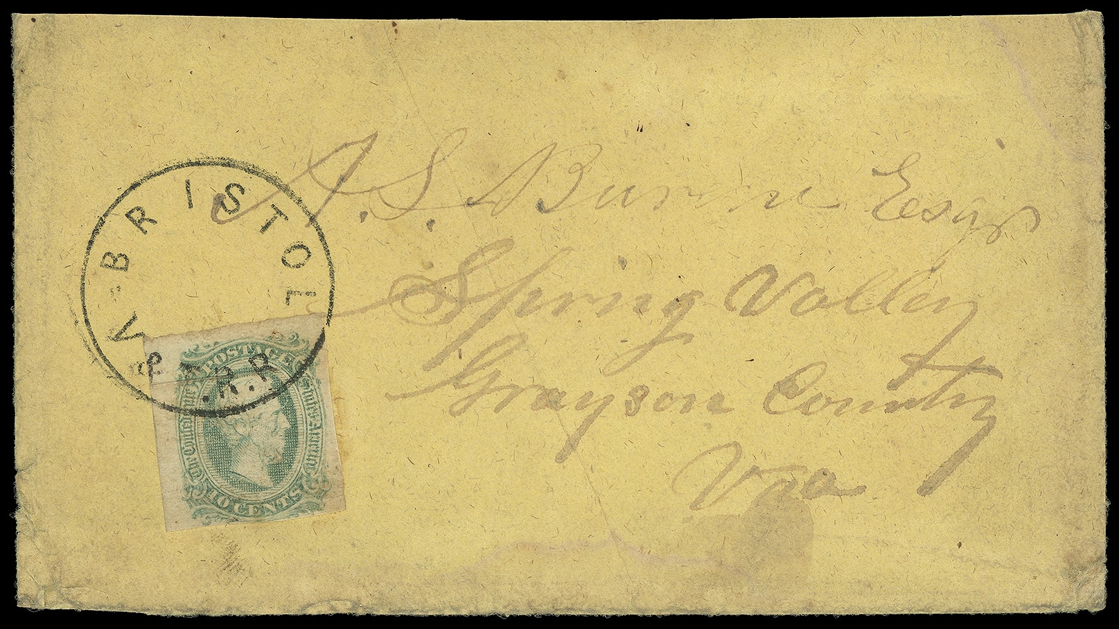 690     11c image1863, 10¢ greenish blue. Preprint paper fold, margins to touching at bottom, tied by sharp complete "Bristol Va R.R." circular railroad postmark on yellow cover to Spring Valley Va.; some cover wear and soiling, reduced slightly at top, no flap, Fine and scarce, signed Kaufmann and Kimbrough.