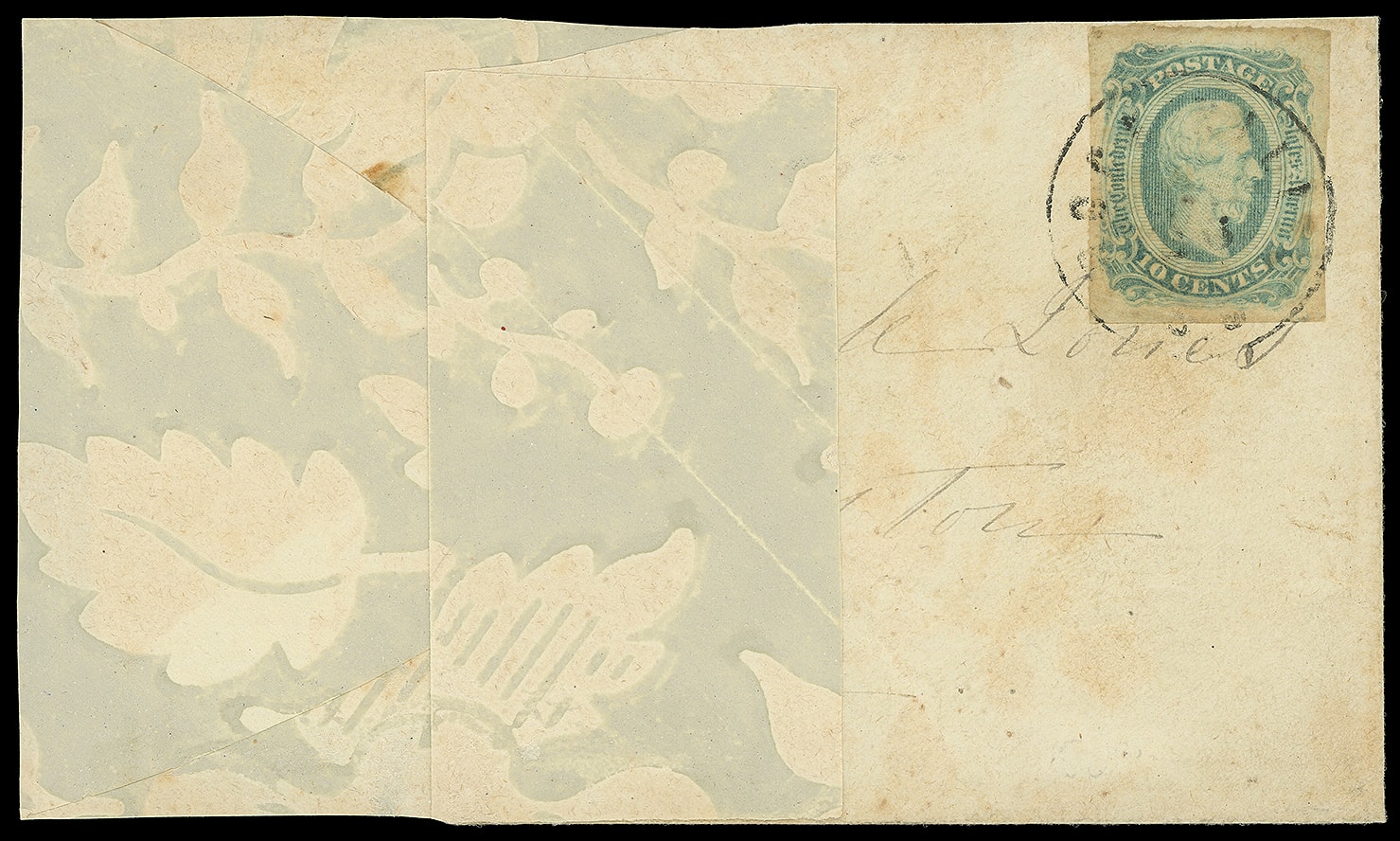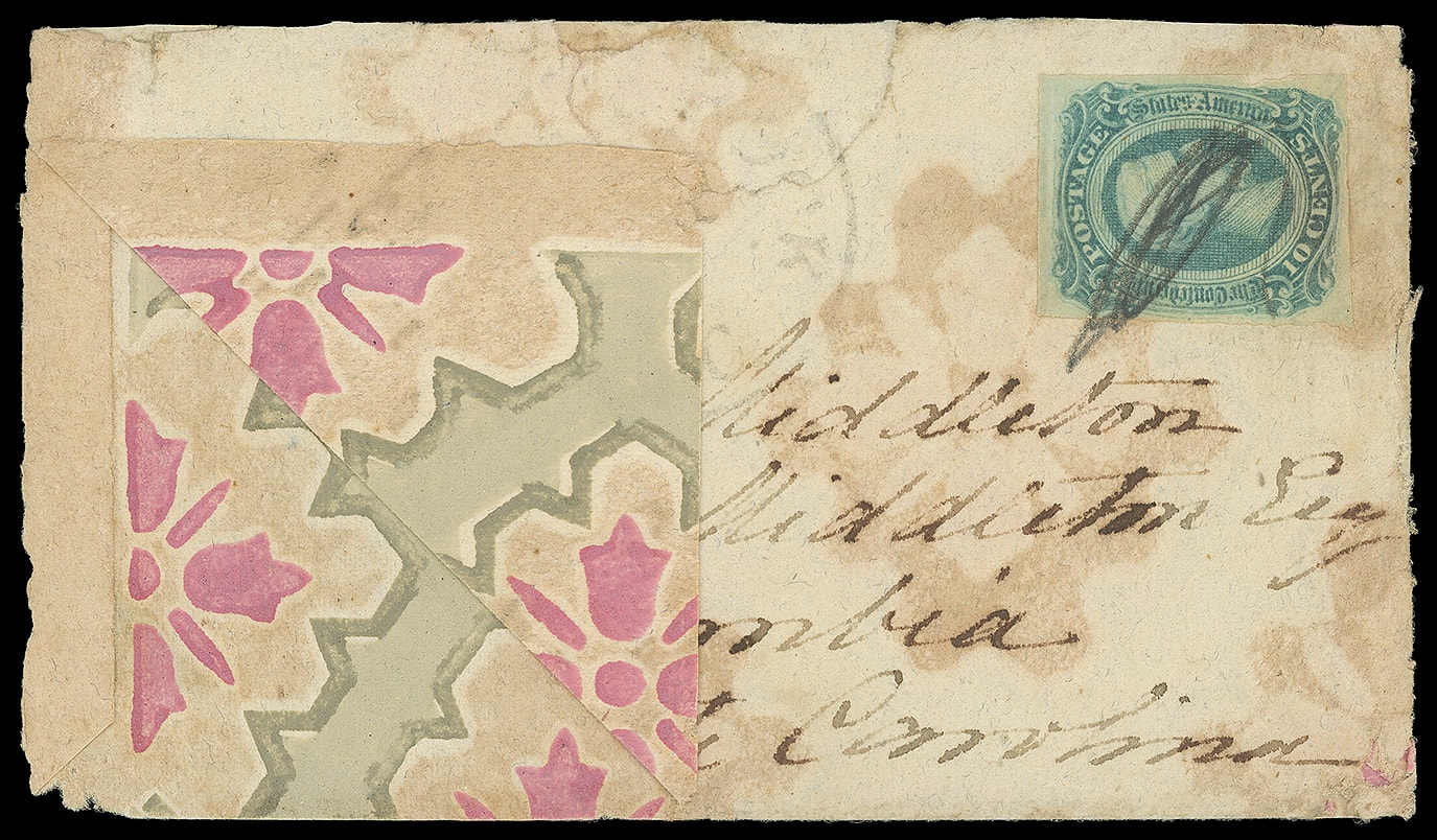 692     12 image1863, 10¢ blue. Four margins slightly irregular at right, tied by pencil on multicolor wallpaper cover showing pink and gray stylized floral pattern with "Flat Rock, N.C. 8 Dec" cds from the well-known Middleton correpsondence to Columbia N.C.; cover tear and some wear, F.-V.F. and attractive, signed Kaufmann.