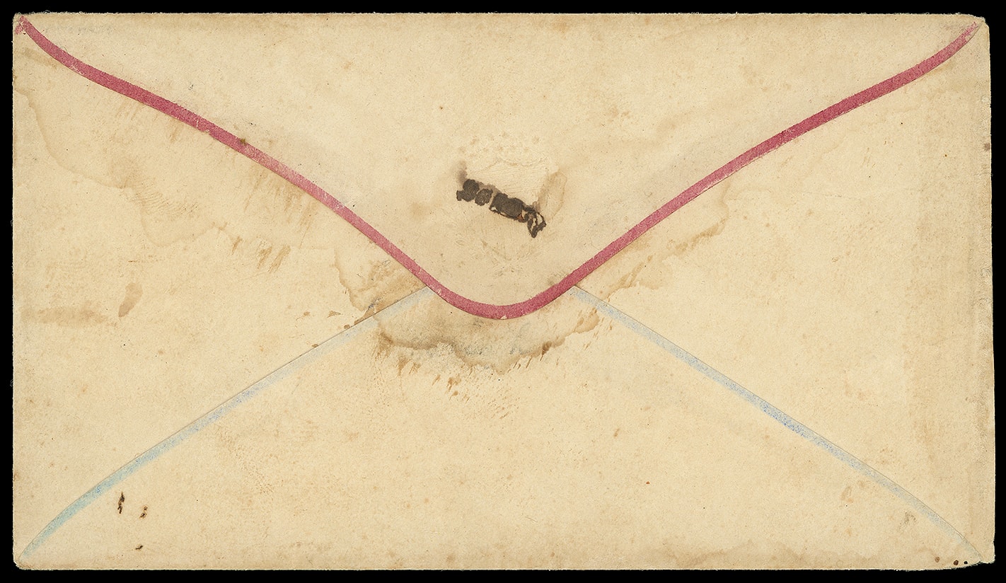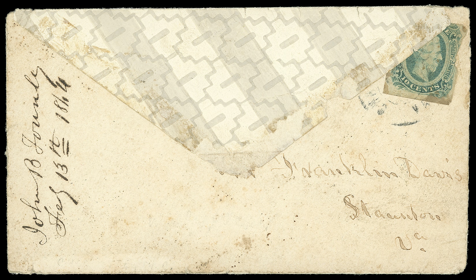 693     12 image1863, 10¢ blue. Large margins to in, irregular margin at right, tied by "Charlottesville Va." cds on gray geometric patterned wallpaper cover to Stanton Va, docketed "Feb 13th 1864" at left; top backflap partially separated and fragile, typical condition for these delicate covers still, F.-V.F. and attractive, signed Kimbrough.