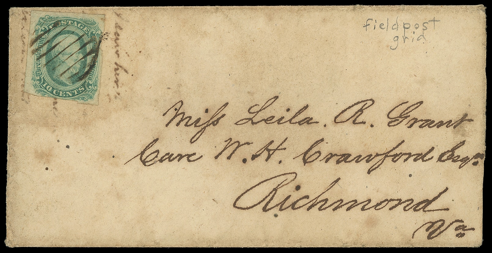 699     12c image1863, 10¢ greenish blue. Margins to touching, tied by Army field grid on cover to Richmond Va., possibly reused envelope with writing "I saw her" underneath stamp; light soiling, F.-V.F., ex-Thacker, signed Kaufmann.