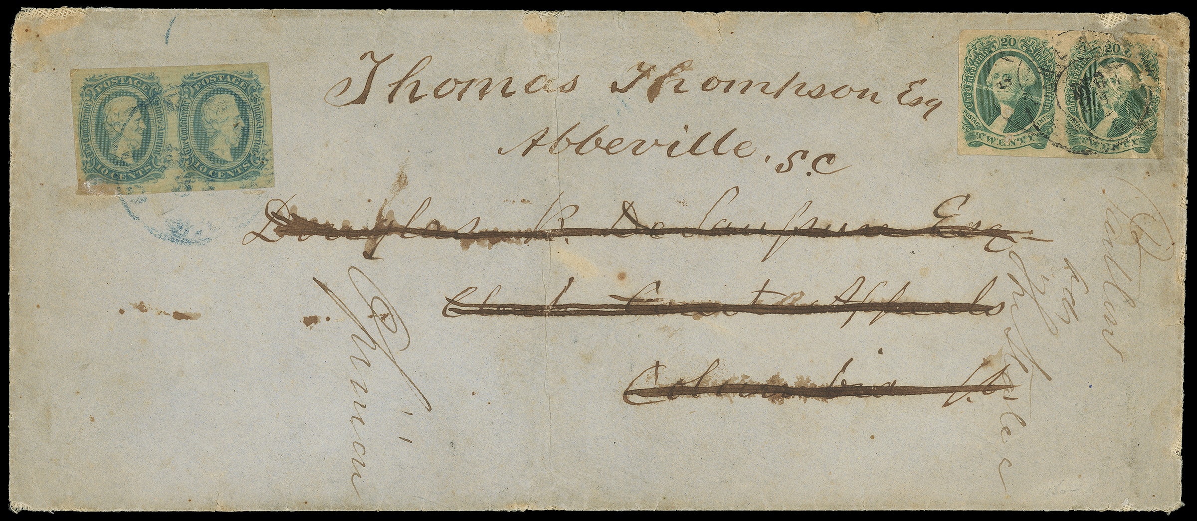700     13 image1863, 20¢ green. Horizontal pair, damaged, tied by indistinct on blue legal-size cover to Columbia S.C., forwarded with 10¢ blue (12) horizontal pair, four margins, tied by blue indistinct "Columbia S.C." cds to Abbeyville S.C., ms. "Opinion" docketing, Fine appearance and unusual combination, ex-McDowell, Karrer.