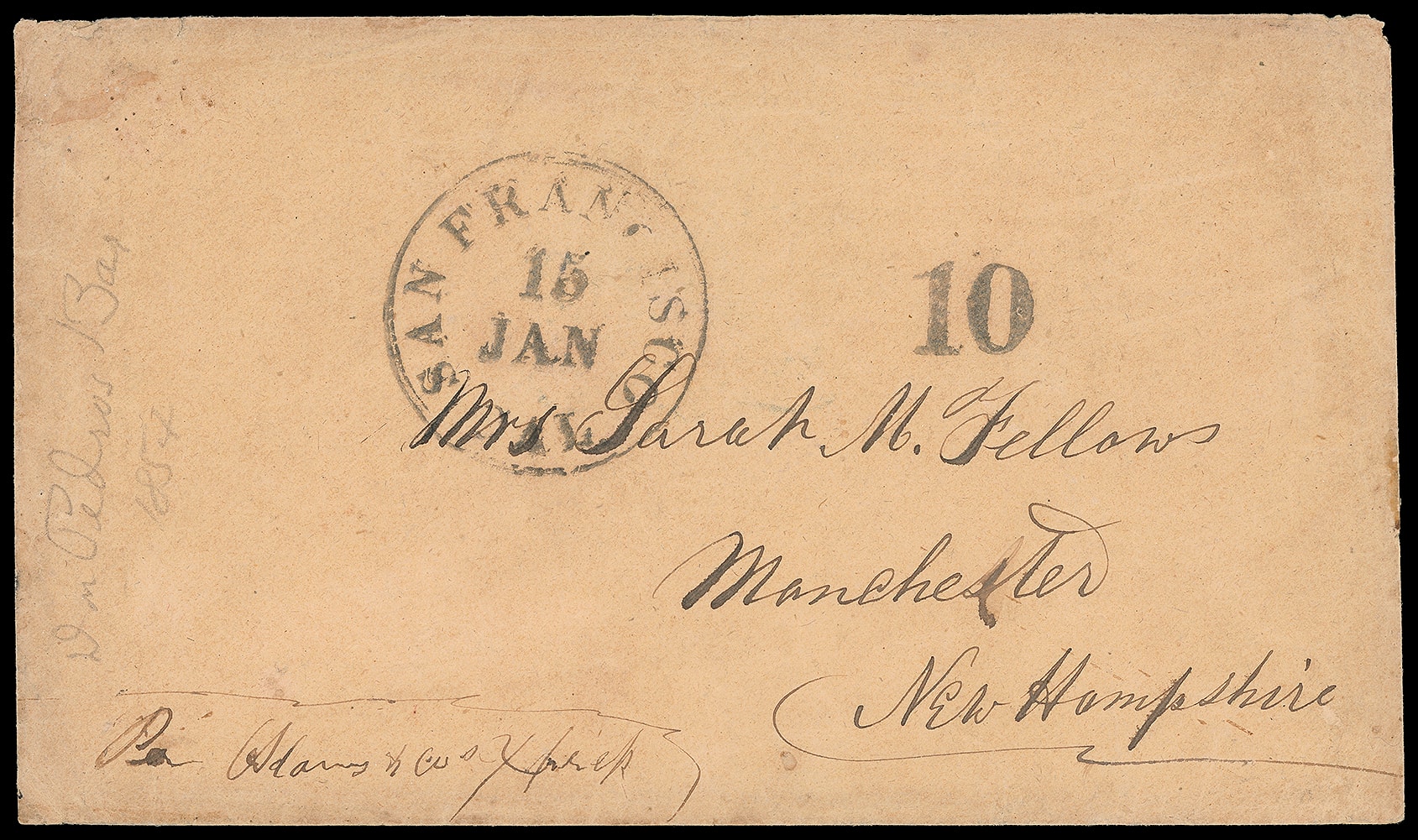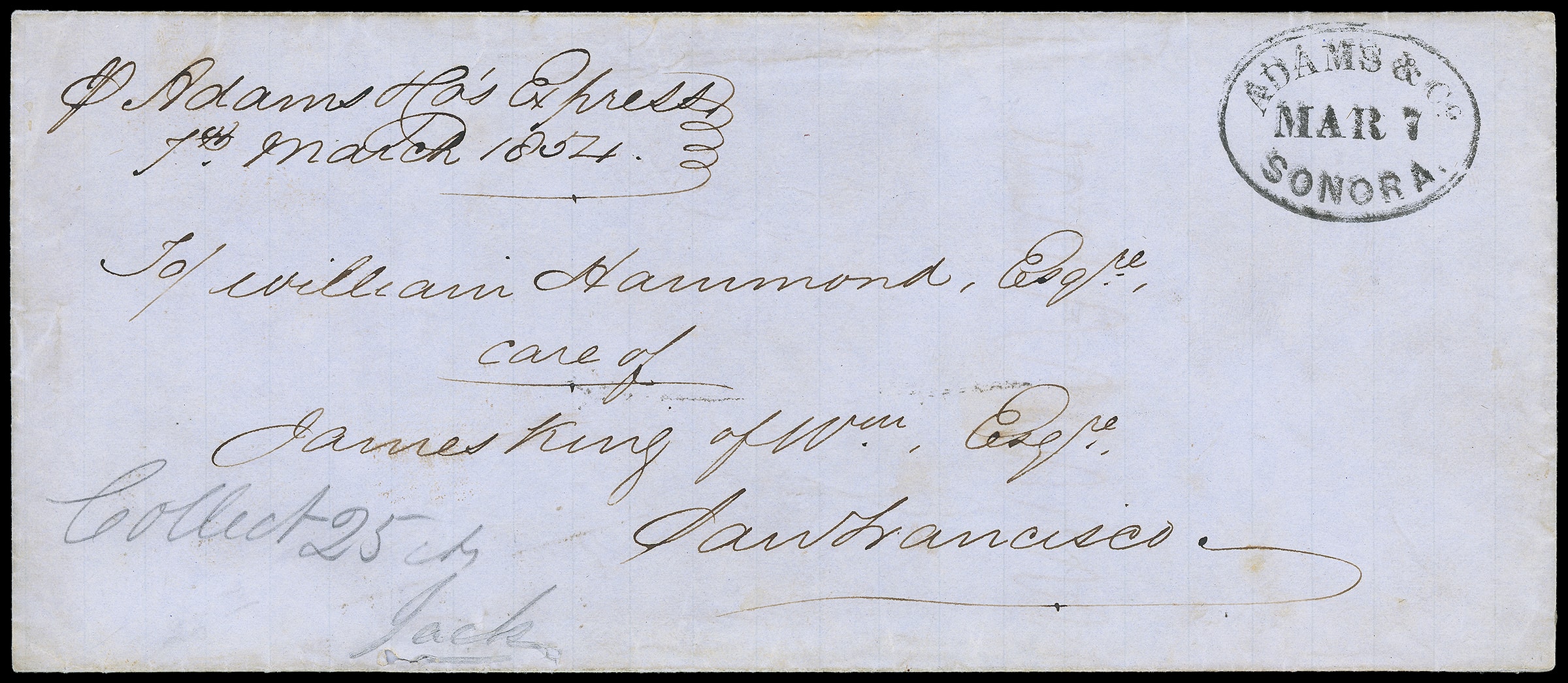 Mar 7. Small black company handstamp with additional manuscript sender's directive "Pr Adams & Co.'s Express 1st March 1854" and Adams' pencil notation "Collect 25 cts, Jack" at lower left on legal-size blue folded cover to San