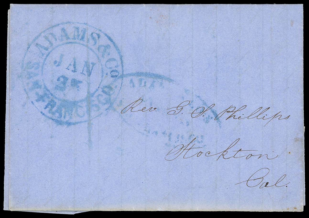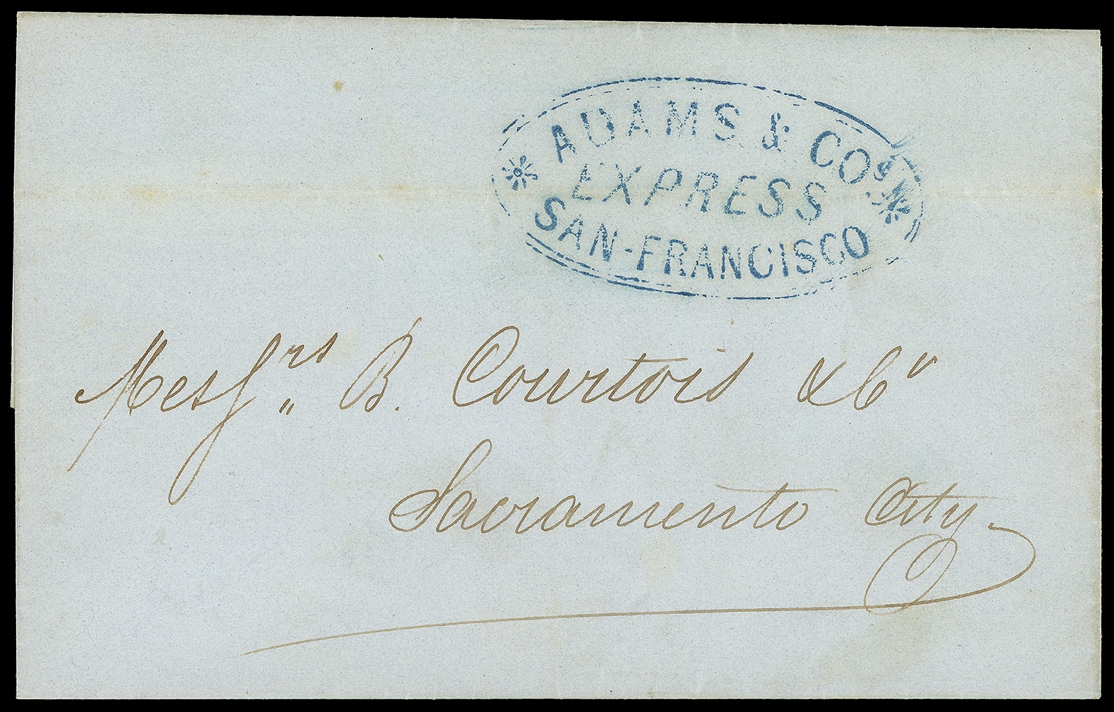San Francisco. Blue oval company handstamp with "star bursts" at ends of oval on blue folded outer lettersheet with docketing in French "1853 Febr 18"; horizontal file fold, F.-V.F. Thomas No. ADA-102; Estimate $100 - 200. (Image1)