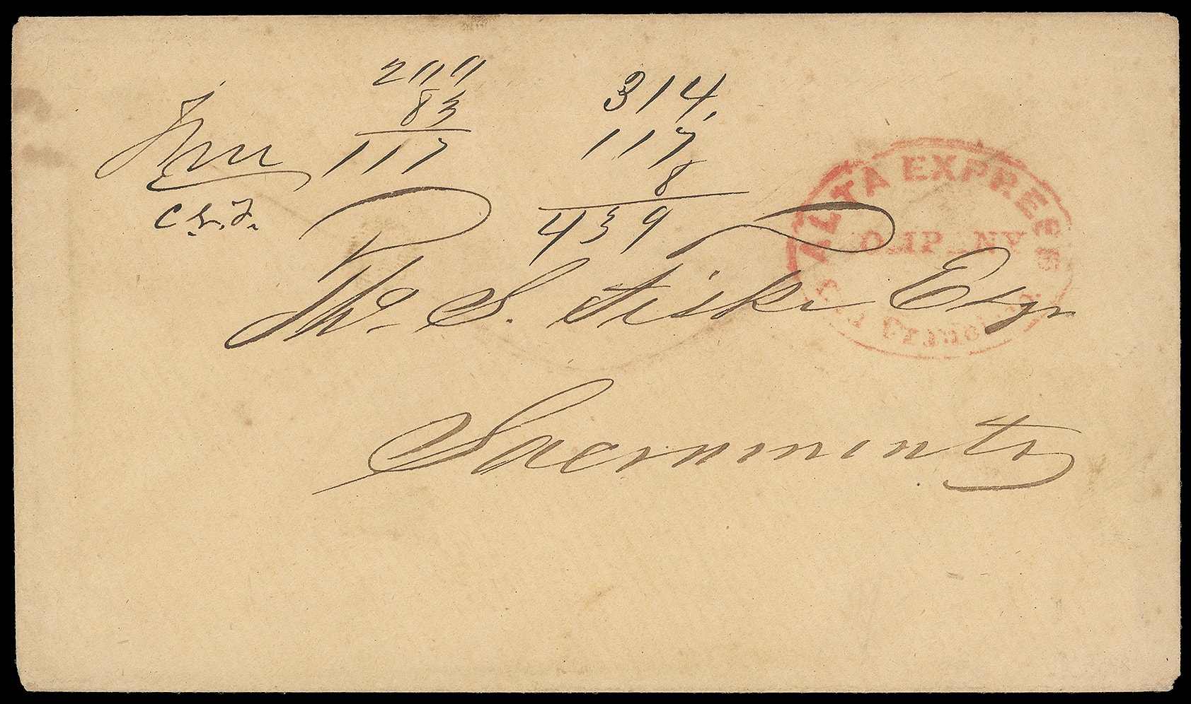 Company, San Francisco. Red company oval handstamp on buff stampless cover to Sacramento Cal.; the lack of a company printed frank and any indication of payment of the required postage, lead on to believe that this was used very early in the