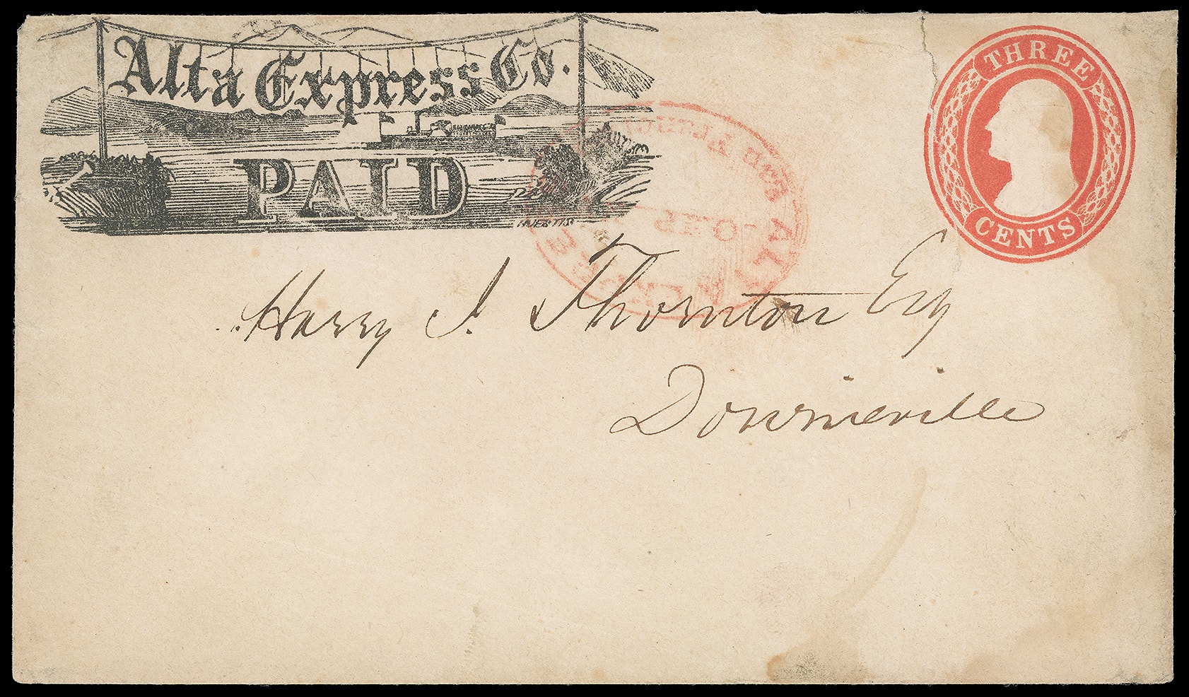 Company, San Francisco. Red company oval handstamp with black company printed frank (Thomas ALT-001) on 3¢ red (U9) Nesbitt entire to Downieville Cal.; light waterstaining at right, most of backflap missing, tear at top just into indicium,