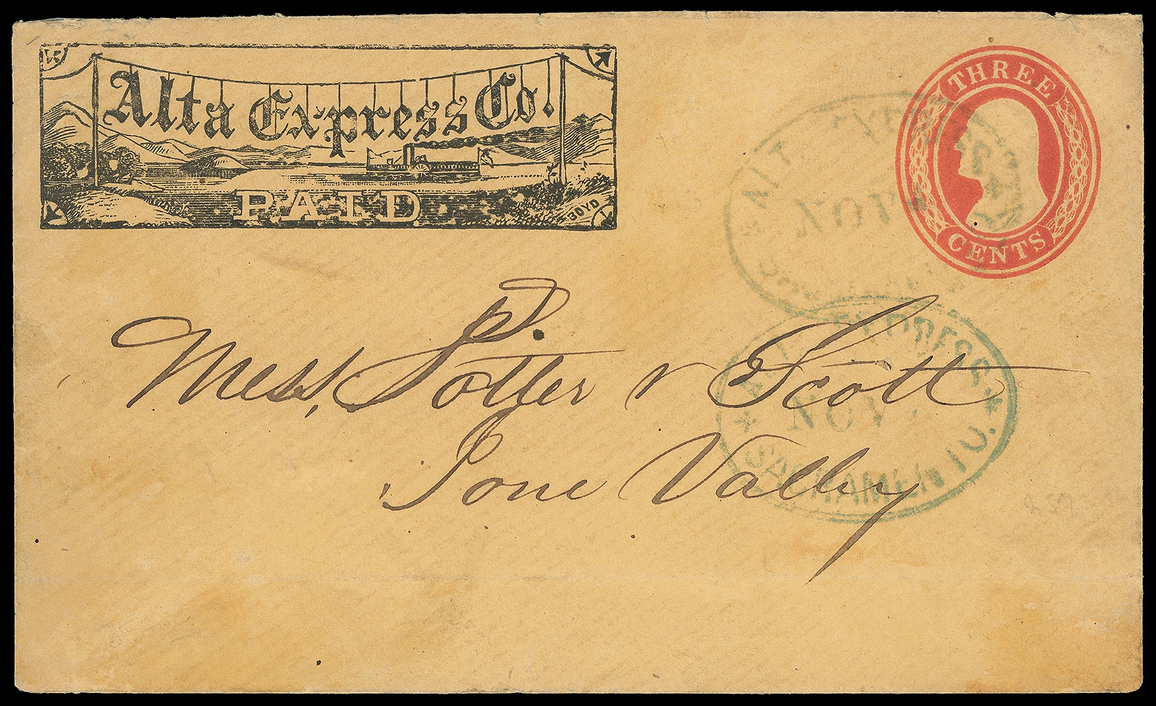 Company, Sacramento. Two strikes of blue company oval with second type of black Alta Express Co. printed frank (Thomas ALT-002) on 3¢ red (U10) Nesbitt buff entire to Ione Valley, Cal.; sealed backflap tear, very light edge and corner wear,