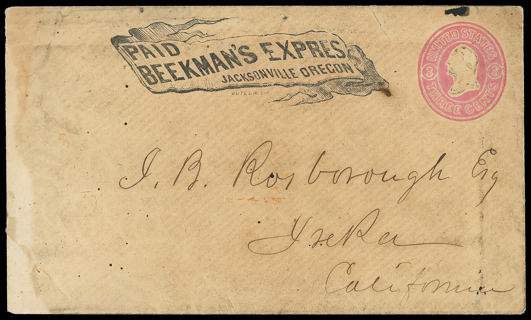 Jacksonville Oregon. Black printed frank on 3¢ pink (U35) buff entire to Yreka, California; light whitening at left side, small tear at top not affecting printed frank or indicium, Fine appearance. Thomas No. BEE-001; Estimate