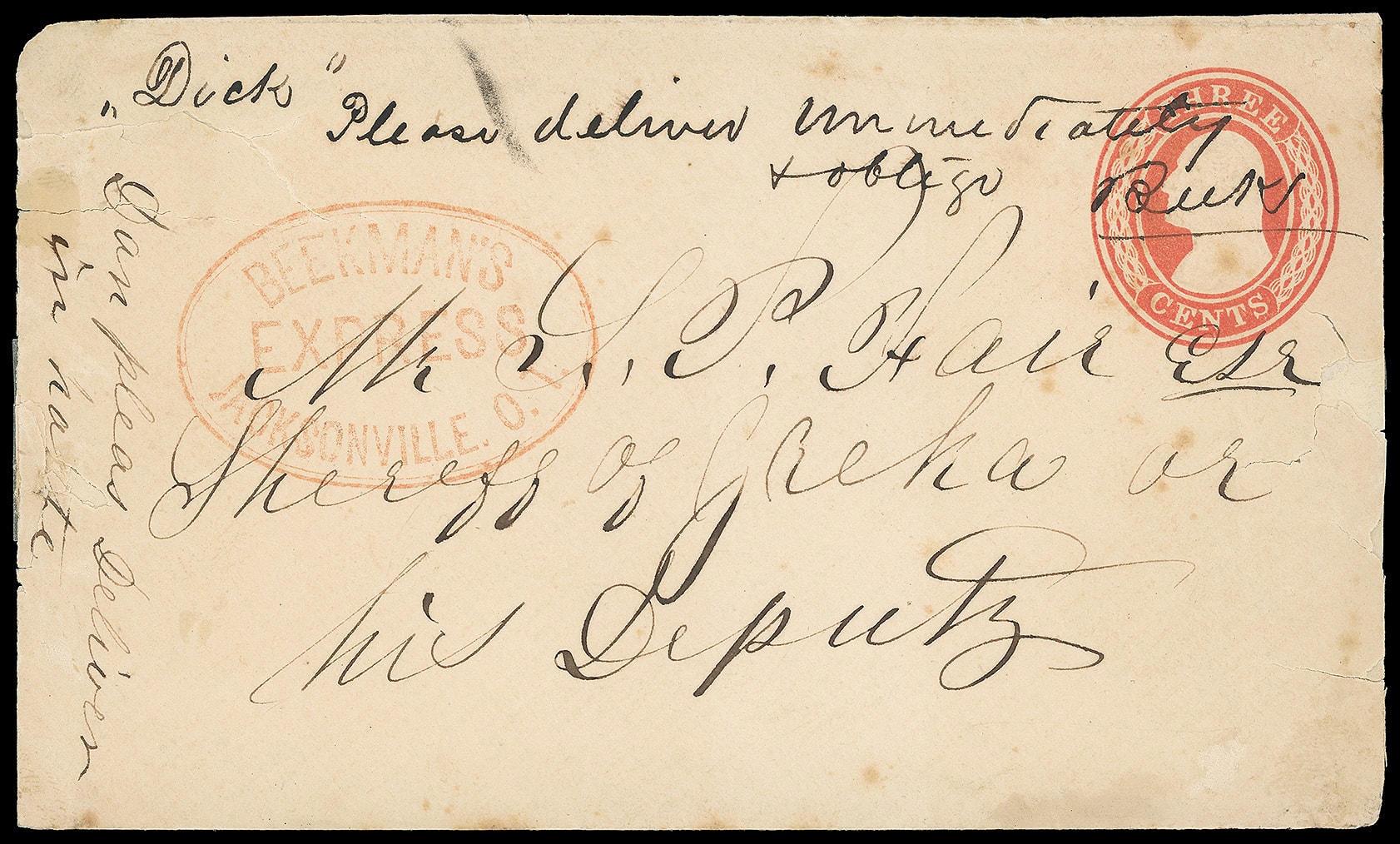 Jacksonville. O.T. Sharp strike of red company oval handstamp on 3¢ red (U9) Nesbitt entire to "Shereff of Eureka or his Deputy" with handwritten note at top from Cornelius C. Beekman himself stating "Dick, Please delivery immediately &