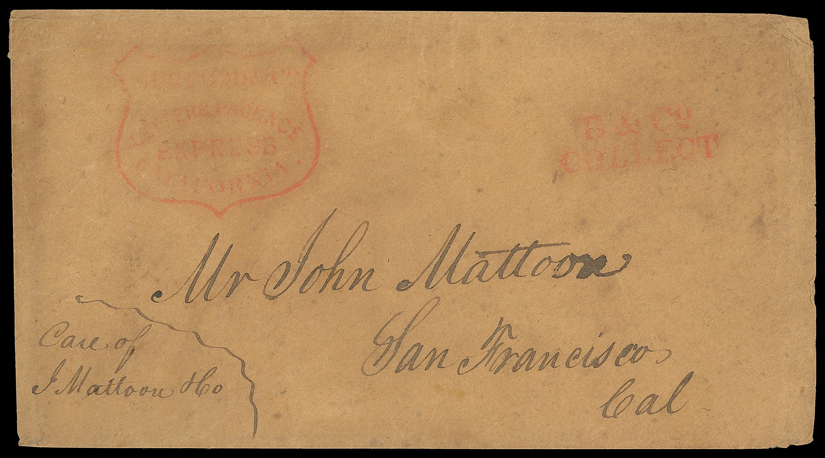 & Package Express, California. Readable red company shield handstamp with matching "B & Co Collect" handstamp (Thomas BER-202e1) on circa 1852 brown cover which likely originated on the East Coast, addressed to San Francisco "Care of J.