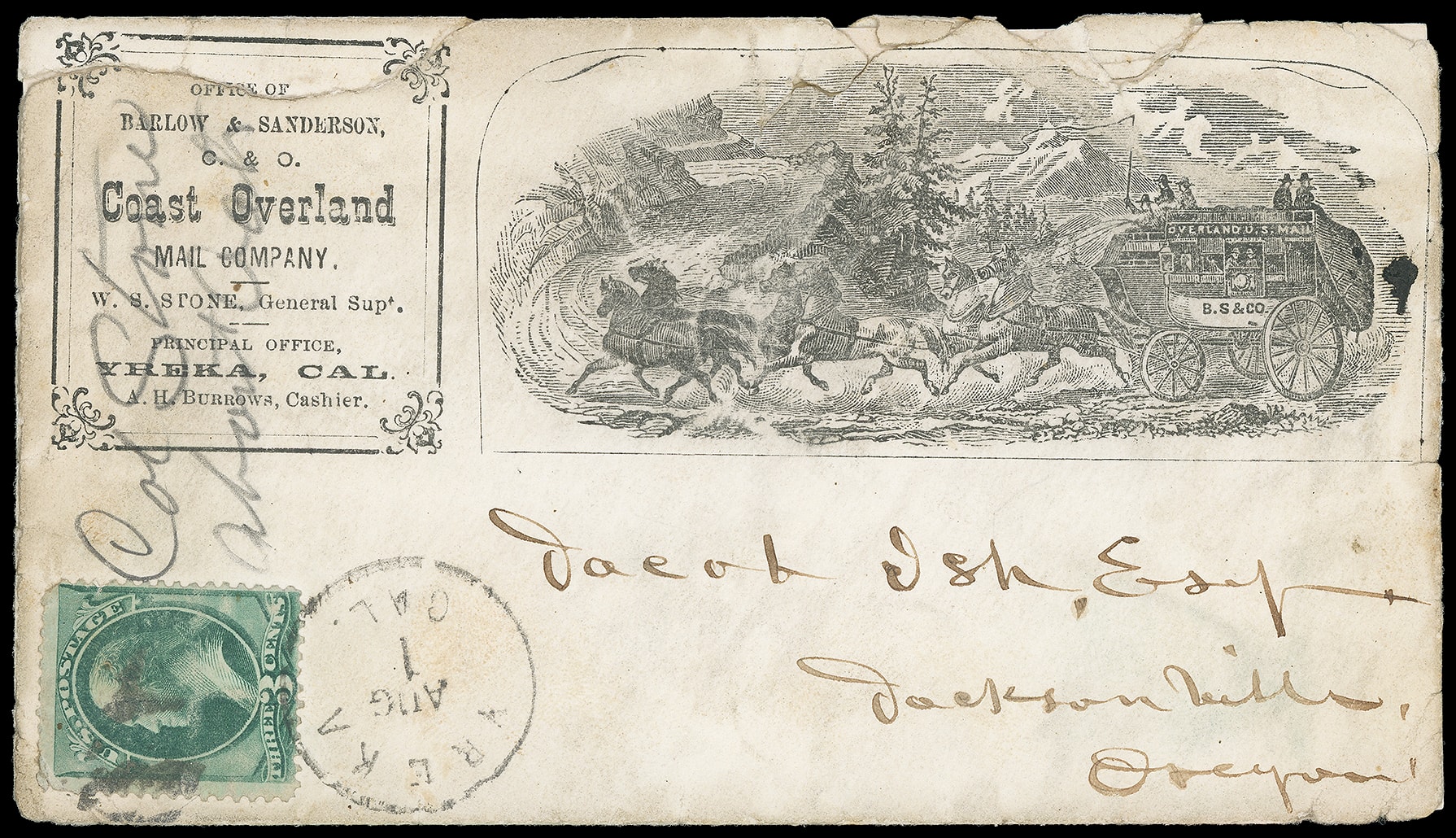 C. & O. Coast Overland Mail Company, Yreka, Cal. Printed advertising corner card (Thomas OVM-408, listed under Barlow, Sanderson & Co) with illustration of six horse stage "Overland U.S. Mail" and "B. S. & Co." on side, cover entered mails with