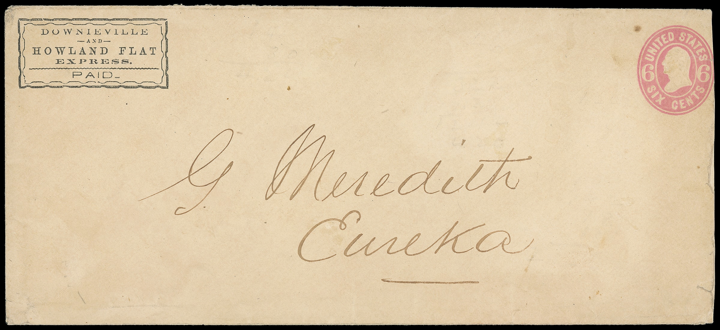 Howland Flat Express, Paid. Black printed frank on 6¢ pink (U62) legal-size entire to Eureka Cal.; slightly reduced at right just into indicium, with small tear at right, also into indicia, otherwise fresh and Very Fine, Thomas