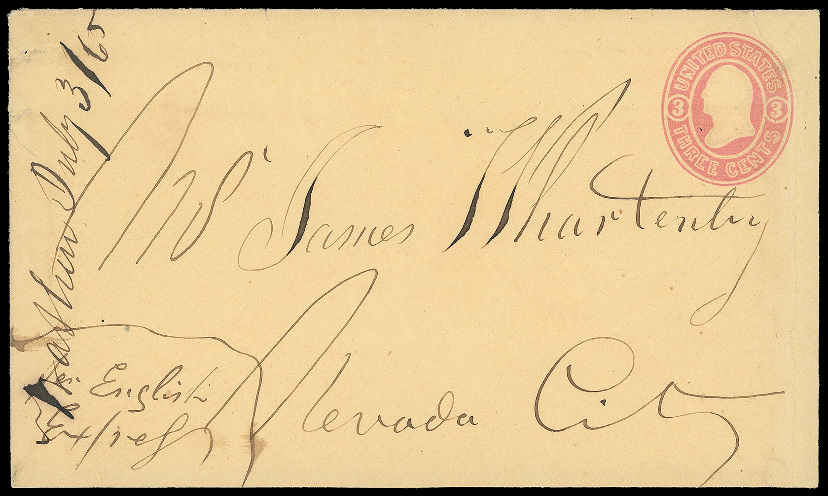 Express. Manuscript sender's directive (unlisted in Thomas) at lower left on 3c pink(U35) buff entire to Whartenby at Nevada City, California, docket "July 3 / 65" at left; professionally restored along right edge into indicia, small tears at