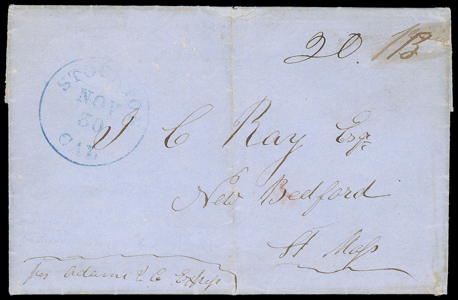 the mails with their blue "Stockton Cal. Nov 30" (1852) cds and manuscript "20" (double rate letter) with smudged out errant rate, to New Bedford, Mass.; slight discoloration along vertial file fold with minor tear and paper loss at top,