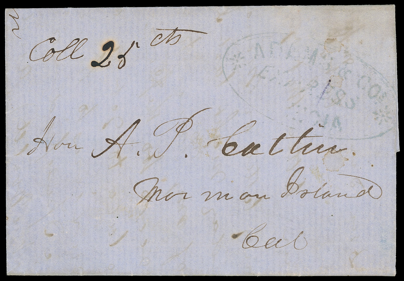 Benicia. Large blue company oval handstamp with starbursts with ms. "Coll 25 cts" express due rating on blue folded business letter datelined "Benicia Aug 19th 1853" addressed to Hon A.P. Catlin, Mormon Island Cal., Fine,