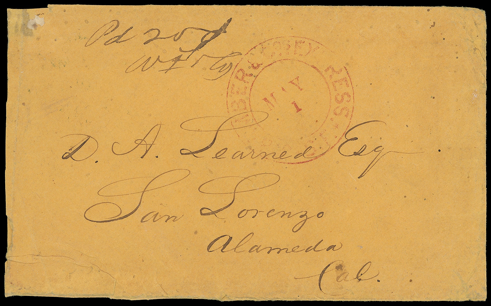one of about eight examples known of this handstamp from Benicia. Thomas No. ADA-102; Estimate $100 - 150. (Image1)