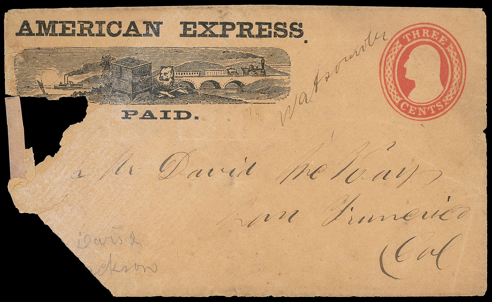 Paid. Black illustrated "dog and safe" printed frank with company manuscript "Watsonville" on 3c red (U10) Nesbitt buff entire to San Francisco Cal.; significant portions of cover chipped away due to brittle paper at left,