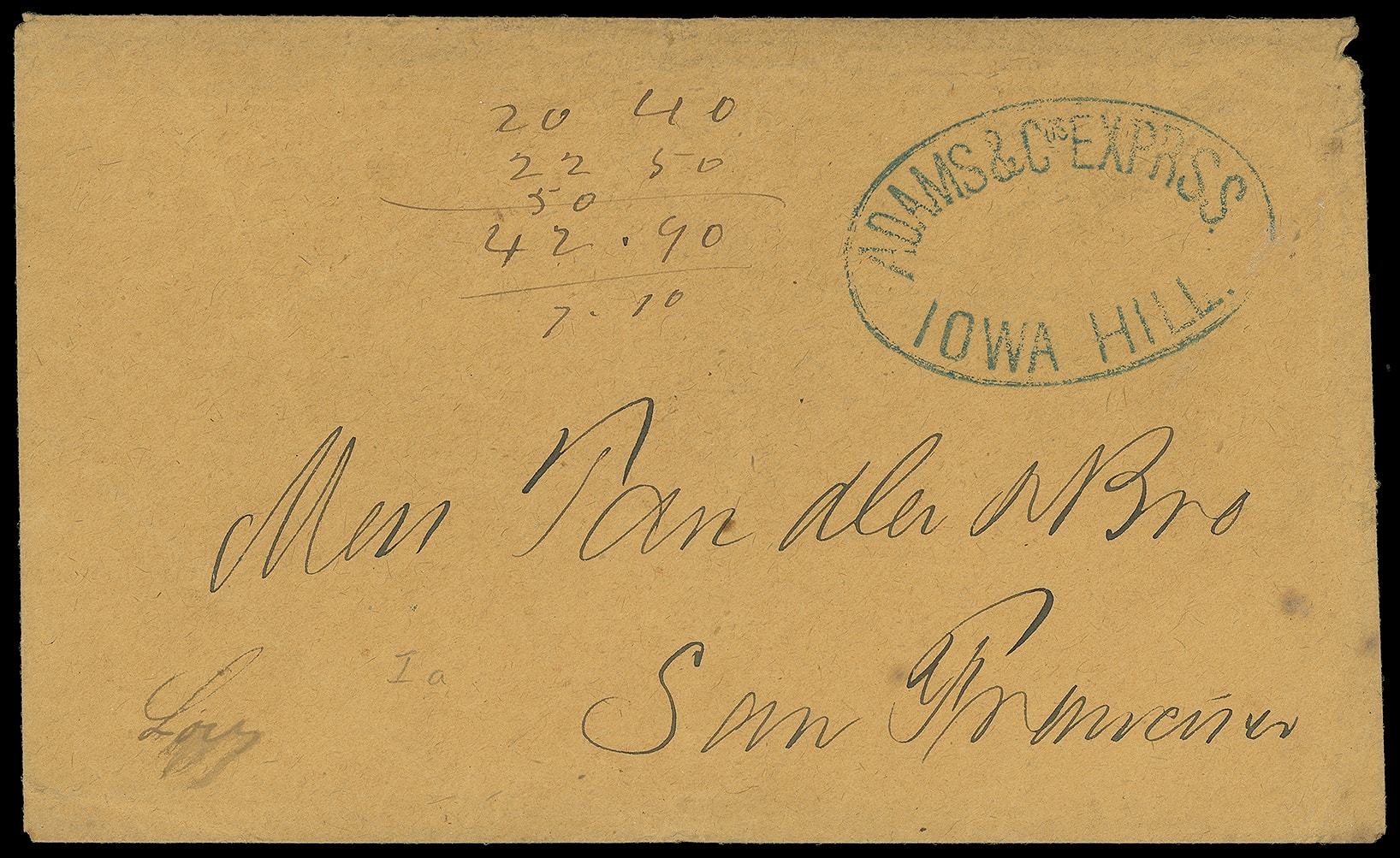 Iowa Hill. Blue oval company handstamp on orange buff cover to San Francisco Cal.; light edge wear at right including minor paper erosion at upper right corner, some math doodling on front, F.-V.F., the only reported example in the