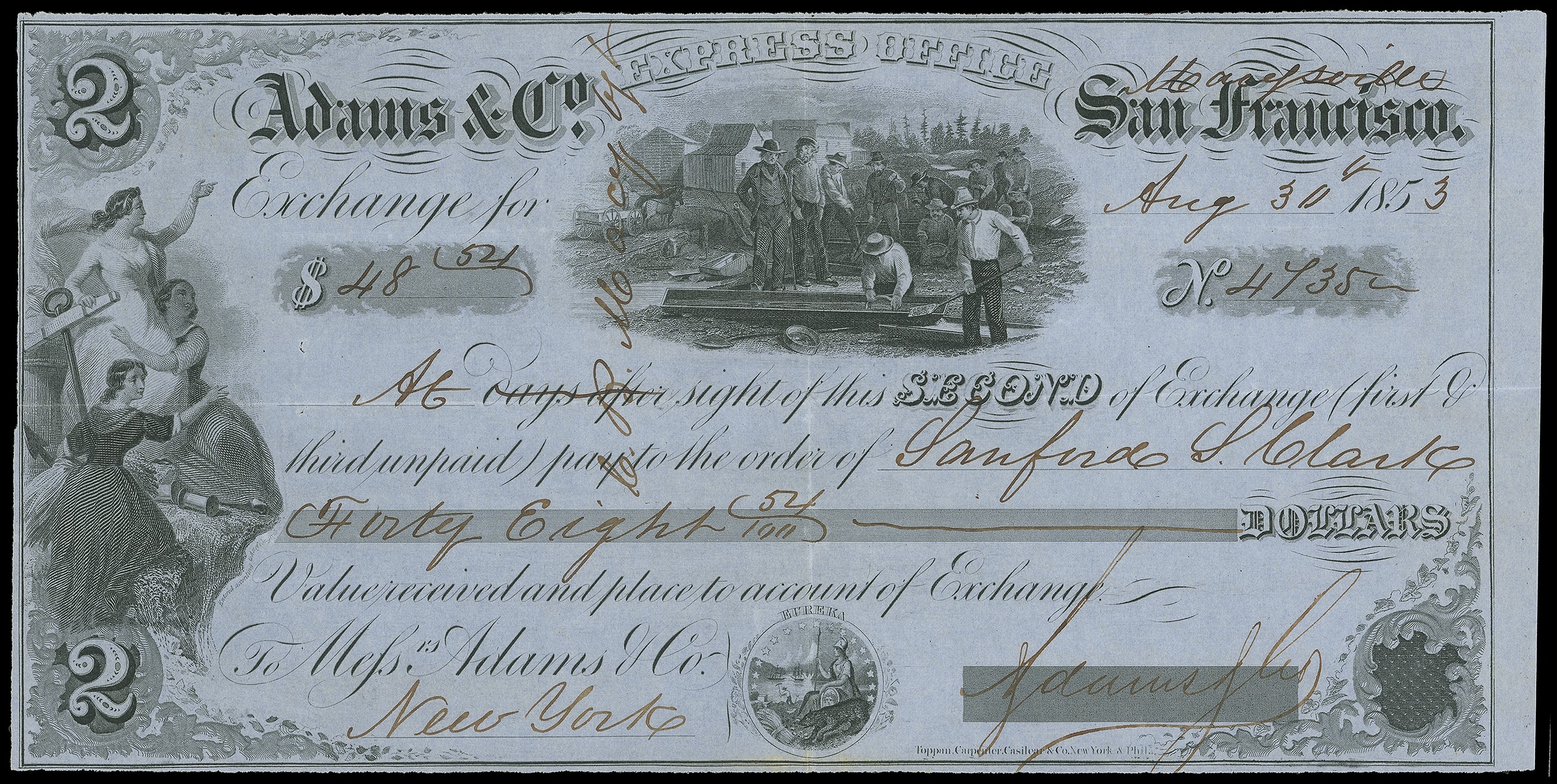 Express. Bank draft on bluish paper, "Adams & Co. San Francisco" with manuscript "Marysville" over San Francisco, dated Aug 30th 1853; several pressed out file folds as exist on virtually all these bank drafts, still Very Fine and
