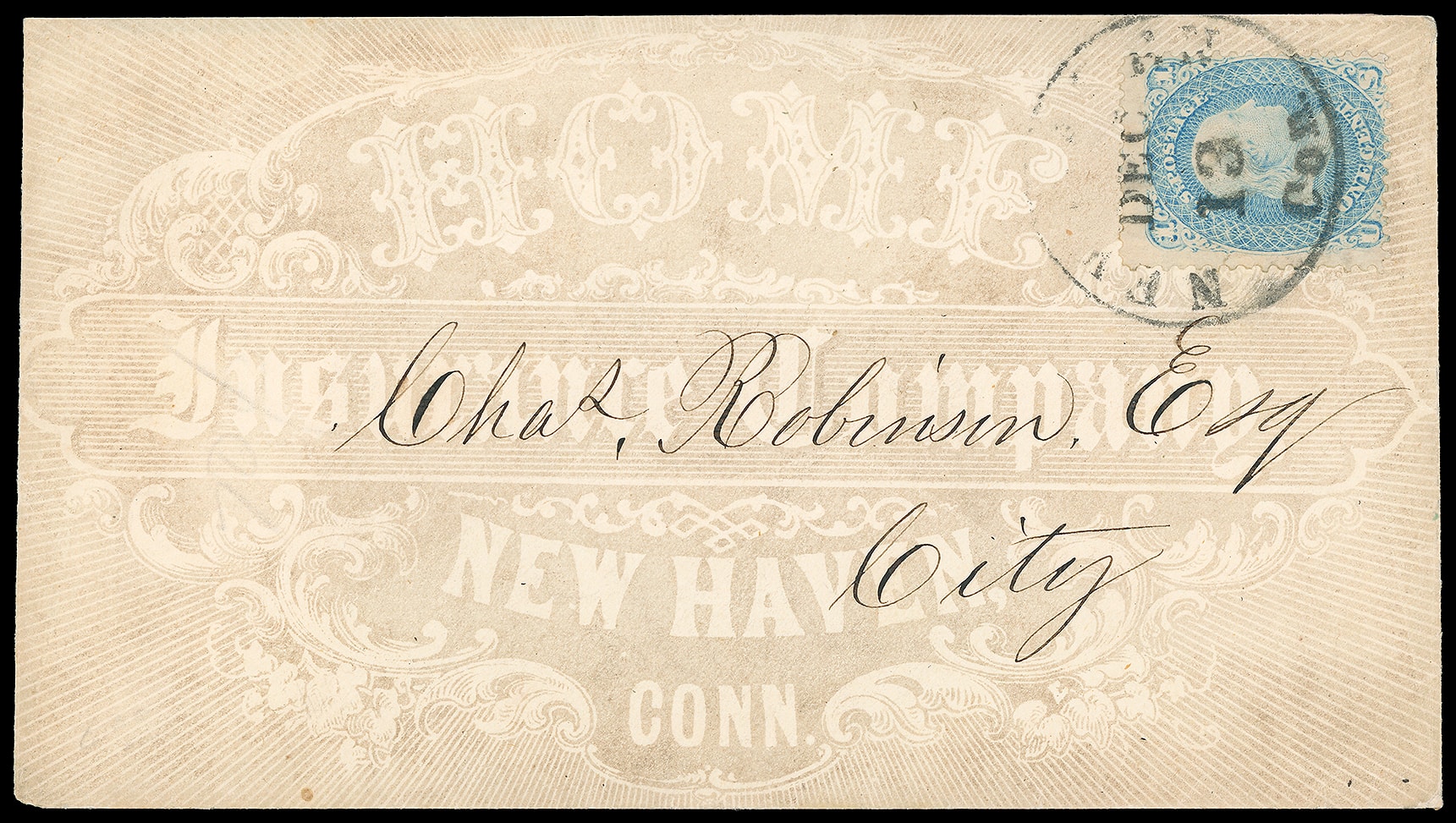 Insurance Company, New Haven Ct. All-over advertising design in light gray on cover bearing 1¢ blue (63) tied by partial "New Haven Con. Dec 13" cds to local city address; part of flap missing, Very Fine. Estimate; $100 -