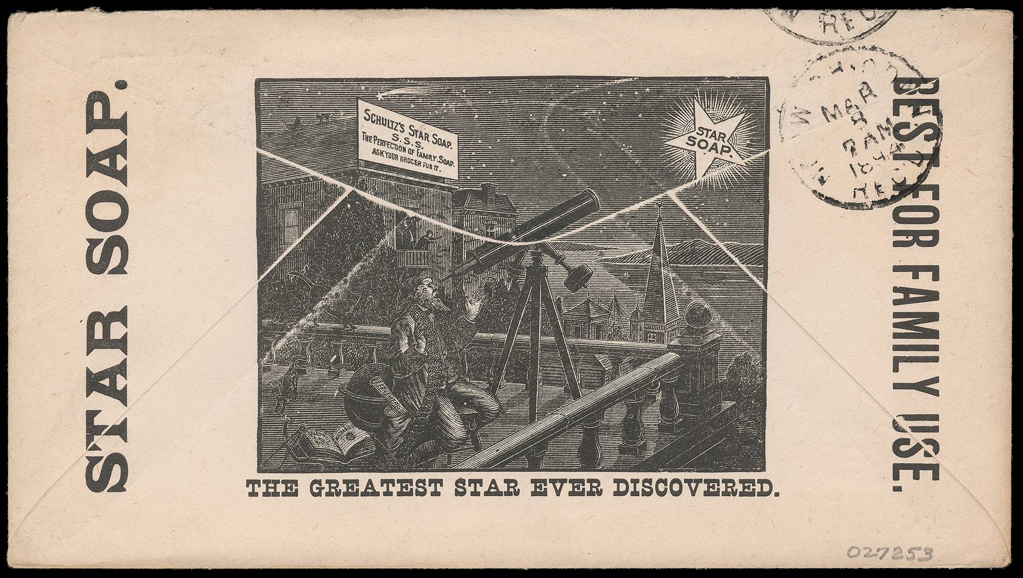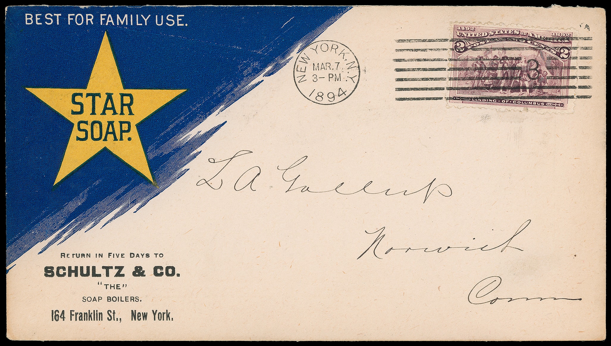Star Soap, Schultz & Co., New York N.Y. Golden yellow and navy blue advertising design on cover bearing 2¢ Columbian (231) tied by "New York, N.Y. Mar 7, 1894" machine cancel to Norwich Conn., Mar. 8th receiving backstamp, reverse