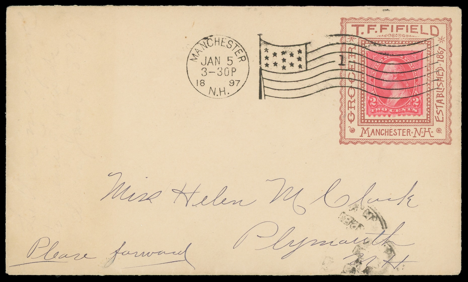Fifield, Manchester, N.H. Ornate brown advertising collar on cover bearing 2¢ carmine (267) tied by "Manchester, N.H. Jan 5, 1897" machine flag cancel to Plymouth, NH, Extremely Fine. Estimate; $150 - 200. (Image1)