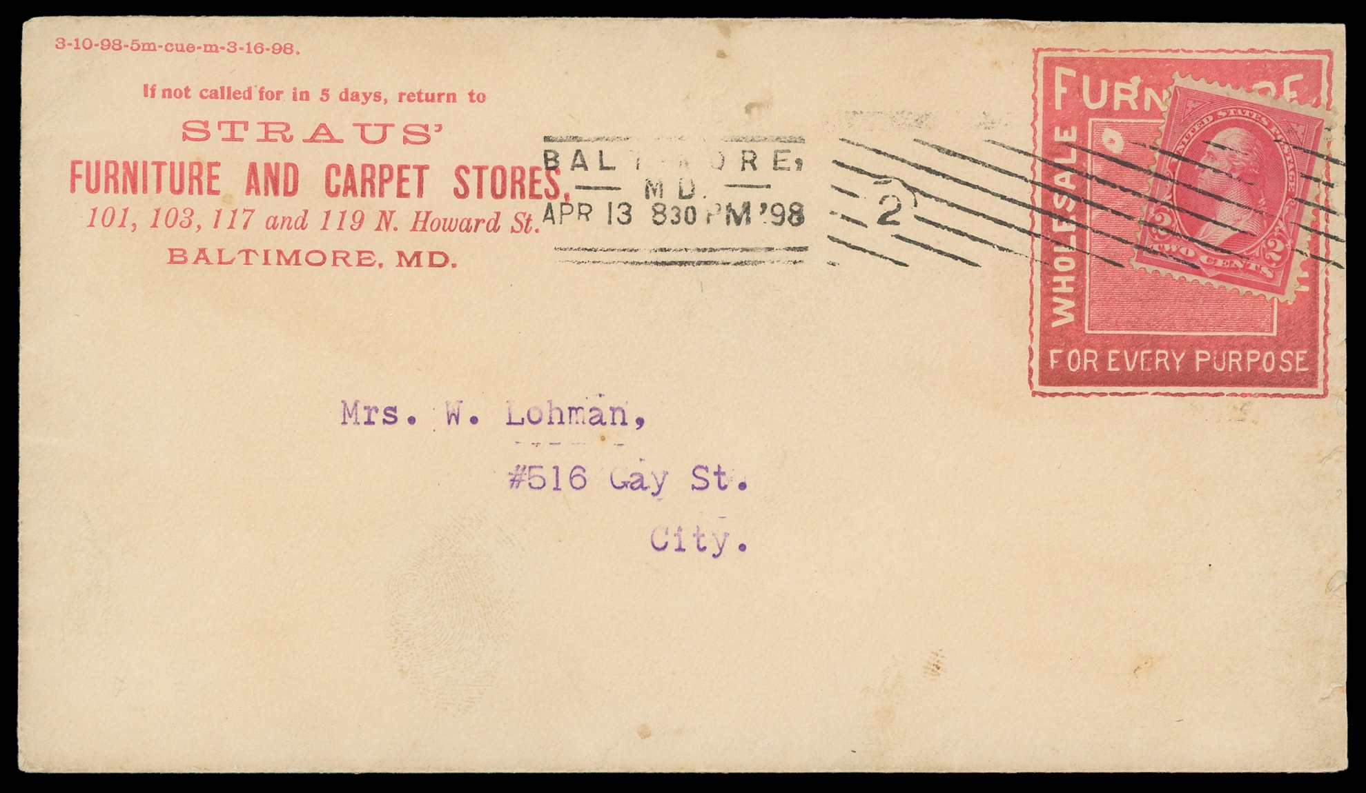 Furniture and Carpet Stores, Baltimore, Md. Large red collar on cover bearing 2c carmine (267) tied by "Baltimore Apr 13 '98" machine cancel to local city street address; tiny nicks and barely reduced still, Very Fine. Estimate; $75 -