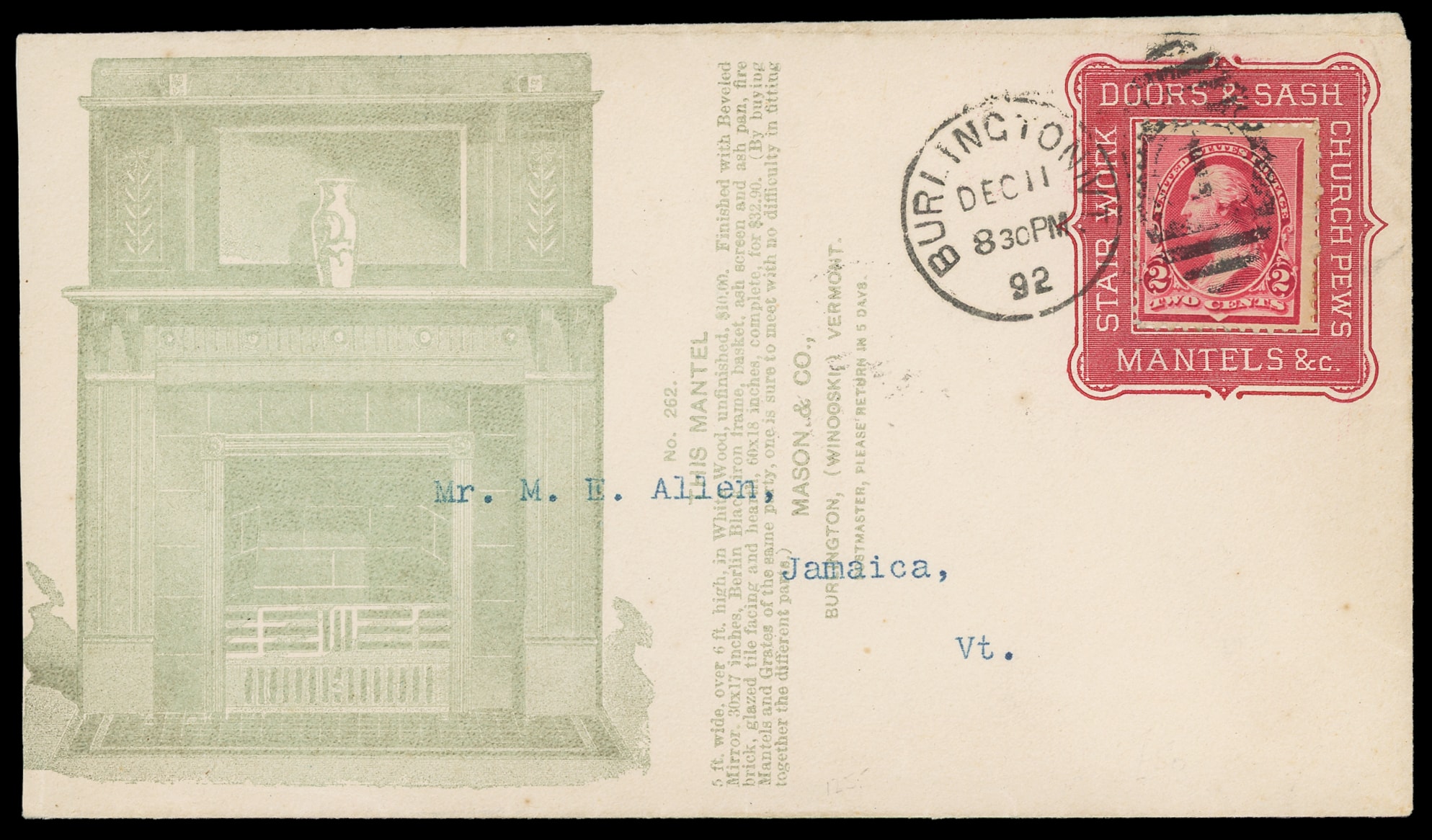 Company, Burlington, Vermont. Red ornate advertising collar and additional illustration in green at left on cover bearing 2¢ carmine (220) tied by "Burlington, Vt. Dec 11 1892" duplex to Jamaica Vt., Very Fine. Estimate; $200 -