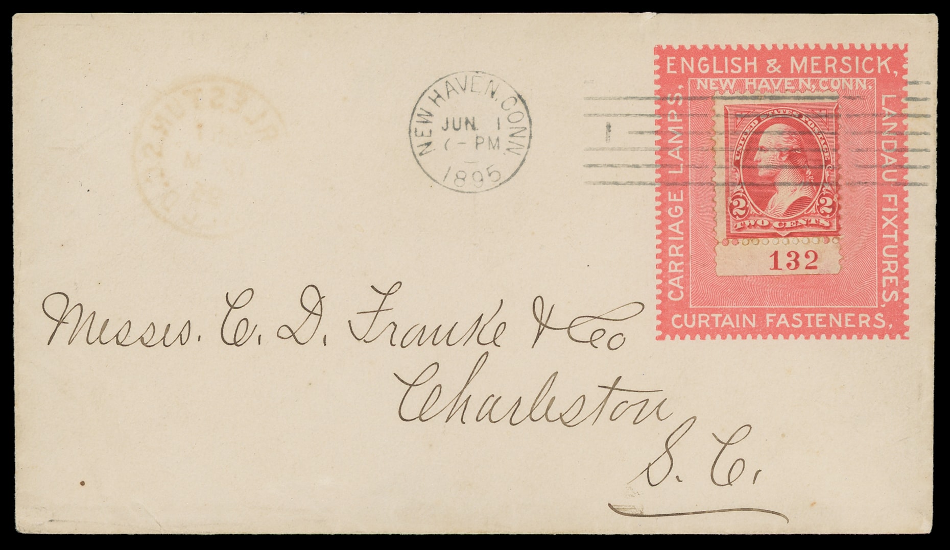 "Carriage Lamps, Landau Fixtures", English & Mersick, New Haven Conn. Ornate pink collar on cover bearing 2¢ carmine (220) bottom P.#132 selvage, tied by "New Haven, Conn. Jun 1 1895" machine cancel to Charleston, S.C., Very