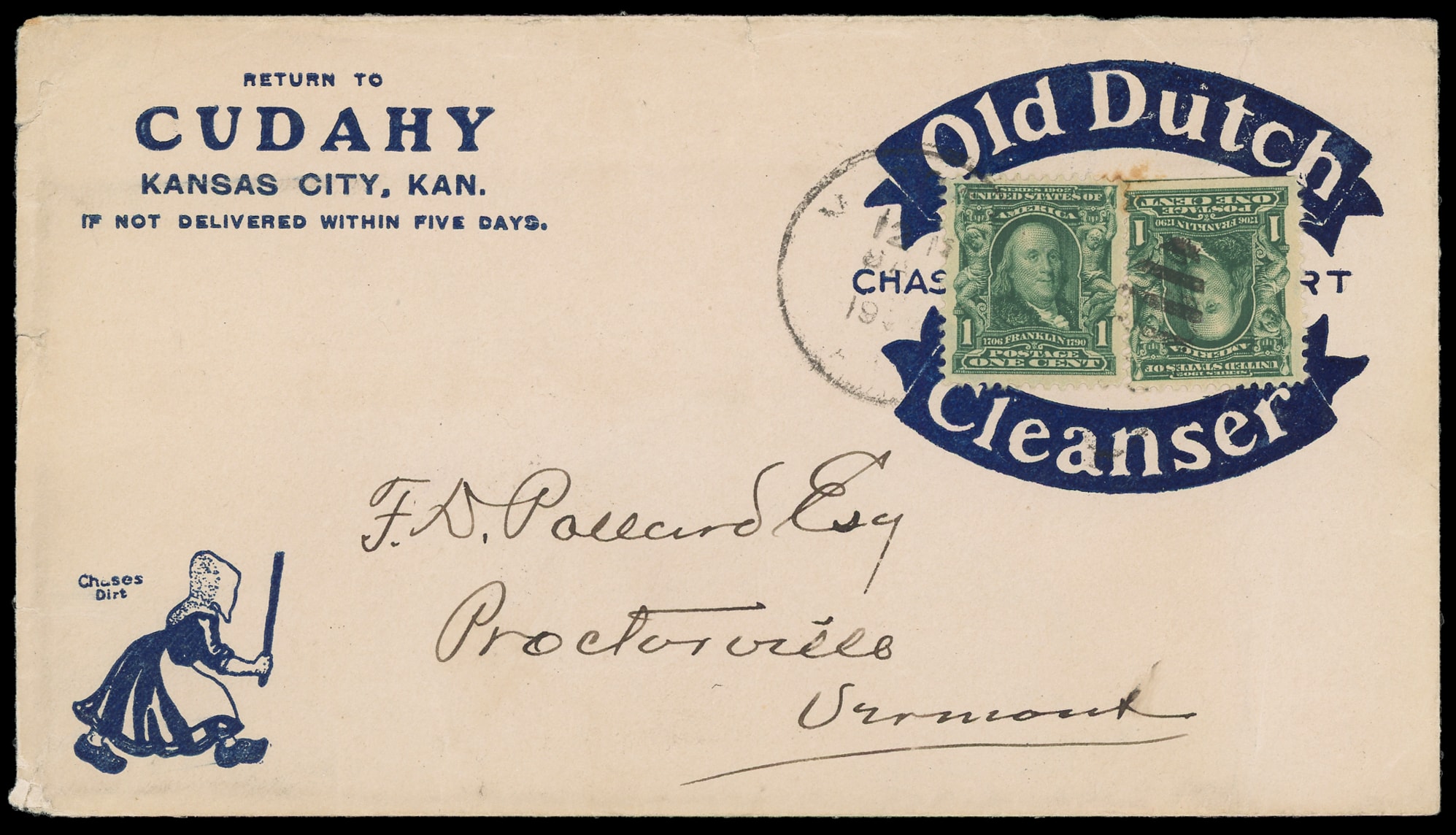 "Old Dutch Cleanser", Cudahy, Kansas City Kans. Blue illustrated front and back advertising on cover bearing two 1¢ green (300) singles tied by indistinct duplex to Proctorville Vt.; some light edge wear and small backflap tear,