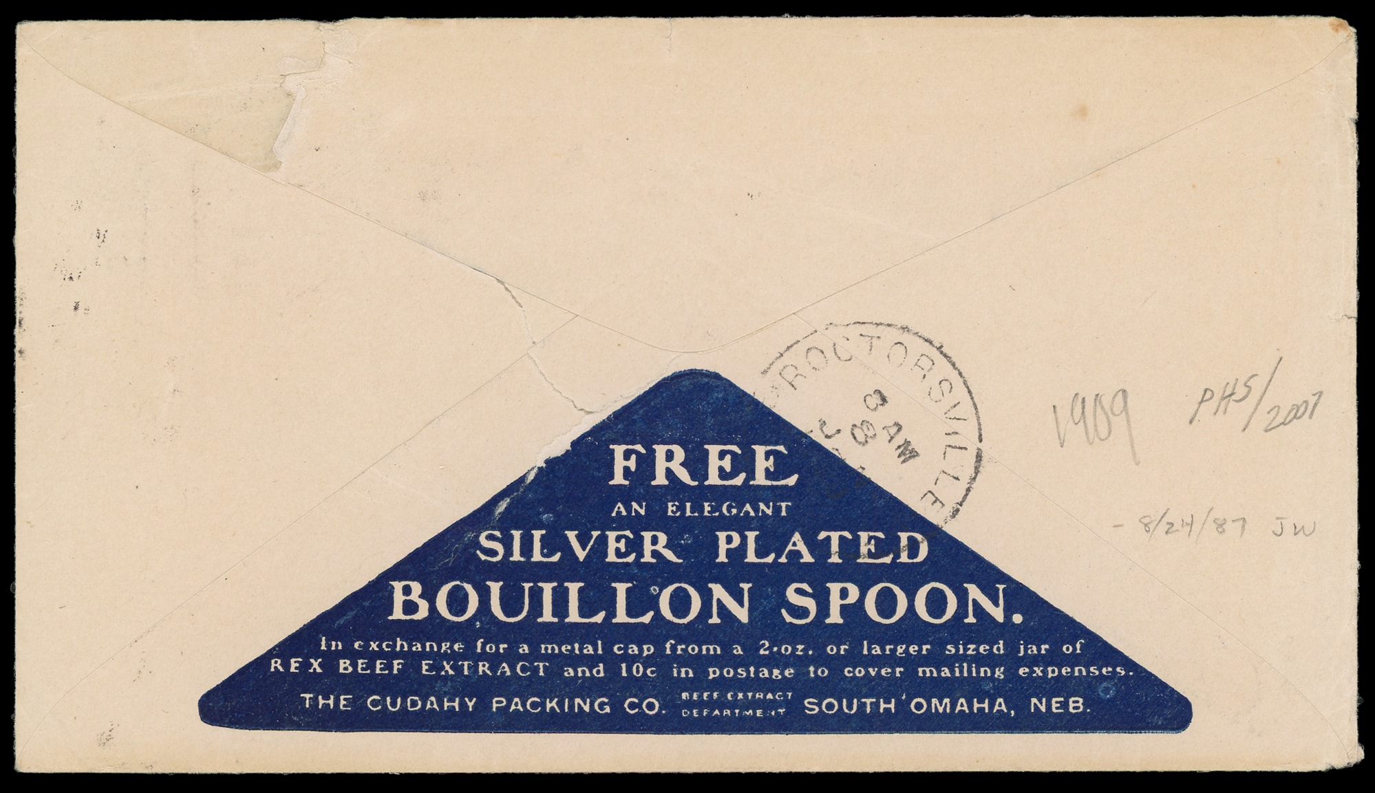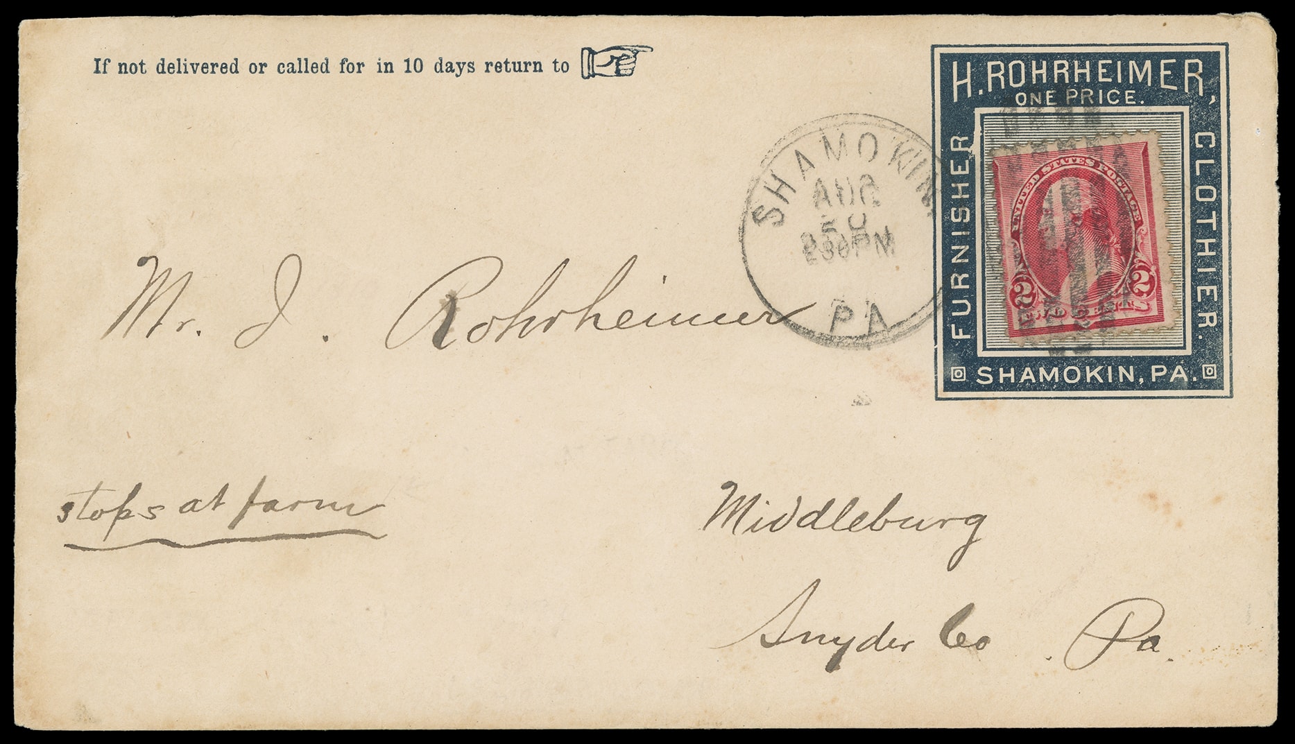 Rohmeirer Clothier, Shamokin, Pa". Green-black squared advertising collar on cover bearing 2¢ carmine (220) tied on cover by "Shamokin, Pa. Aug 20" duplex to Middleburg, Pa., Aug. 24, 1891 arrival backstamp, Very Fine, ex-Biddle,