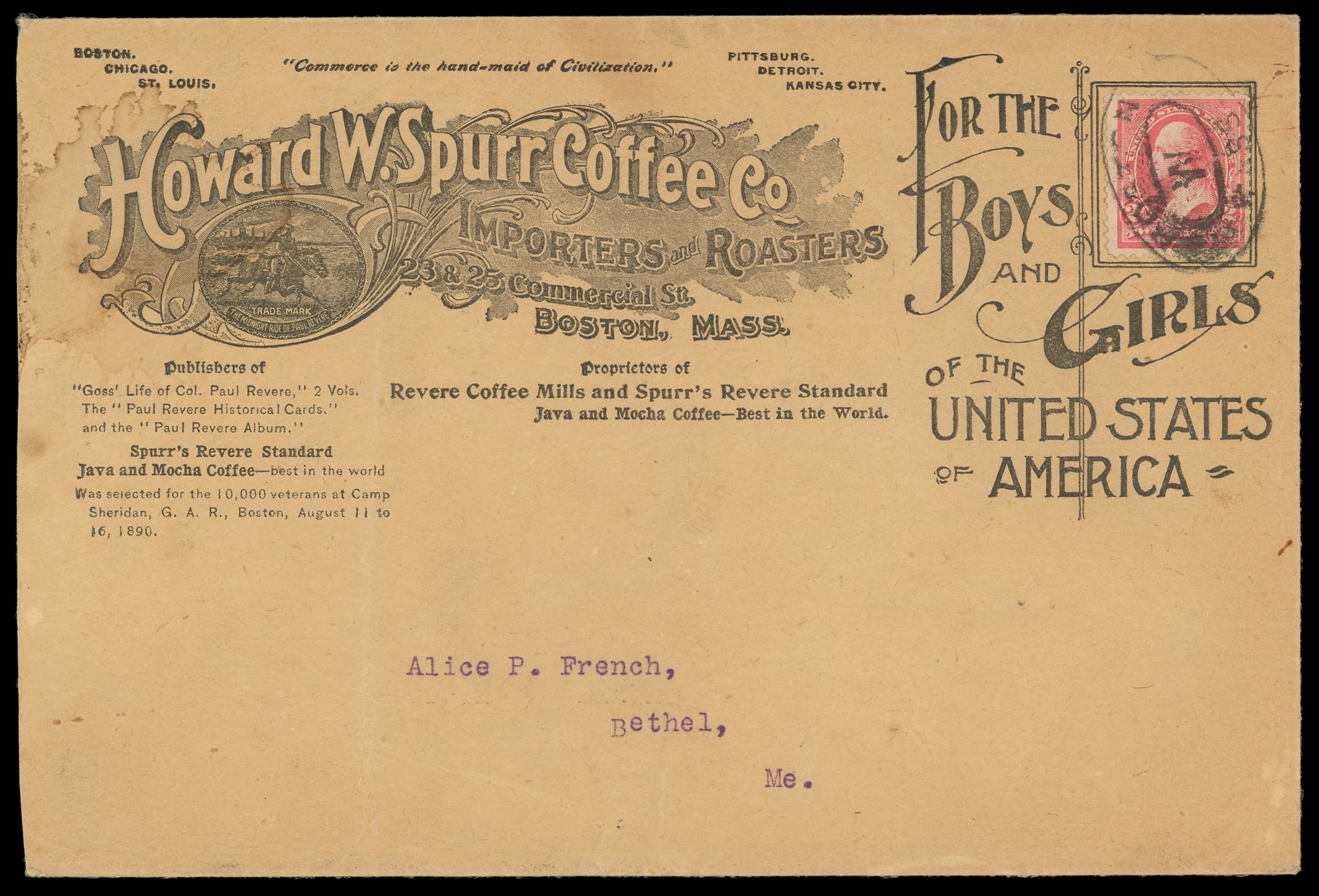 Howard W. Spur Coffee Co., Boston, Mass. "For The Boys and Girls of the United States", illustrated advertising on 7-3/4" x 5" manila envelope, 2¢ (267) tied by "Boston, Mass." double oval, type addressed to Bethel, Me., light waterstain and