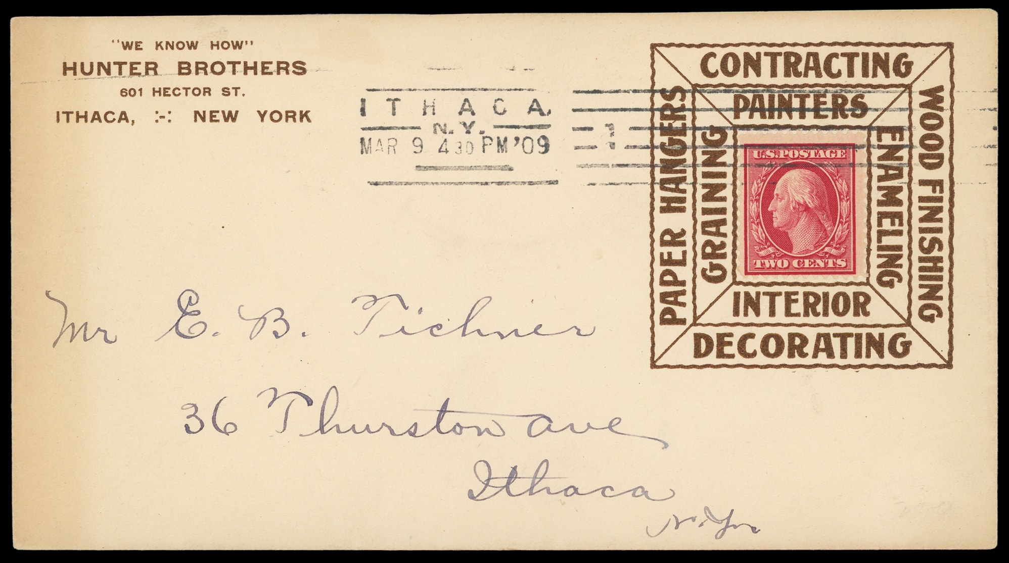 Contractors) Hunter Brothers, Ithaca, N.Y. Large brown advertising collar on cover bearing 2¢ carmine (332) tied by "Ithaca, N.Y. Mar 9 4:30PM '09" machine cancel to Ithaca, NY; extremely light edge toning still, F.-V.F. Estimate;