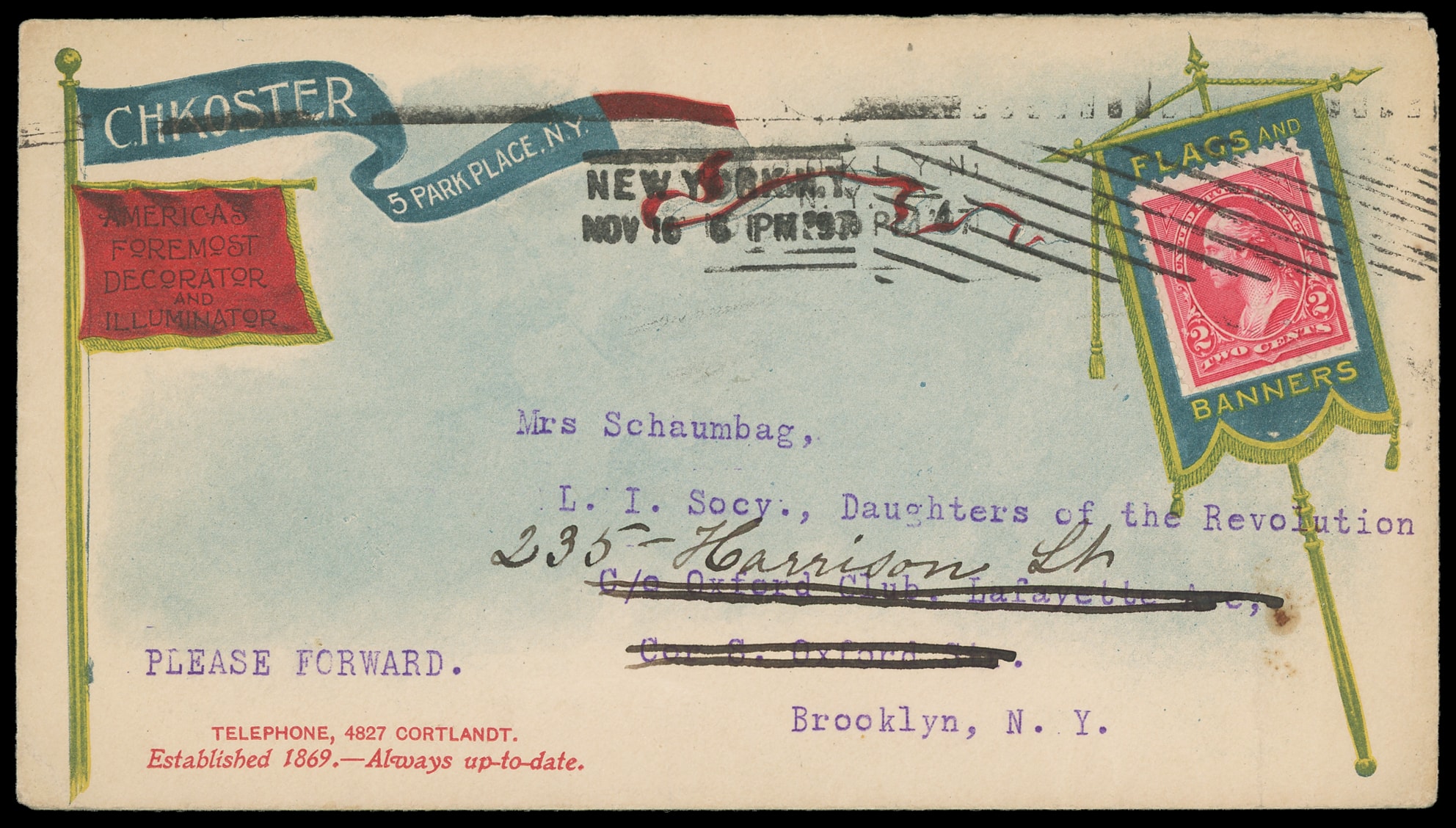 Koster, New York. Multicolored advertising collar banner, additional near overall multicolored advertising on cover bearing 2¢ carmine (267) tied by "New York, N.Y. Nov 16 '97" machine cancel to Brooklyn N.Y.; backflap with small piece out,