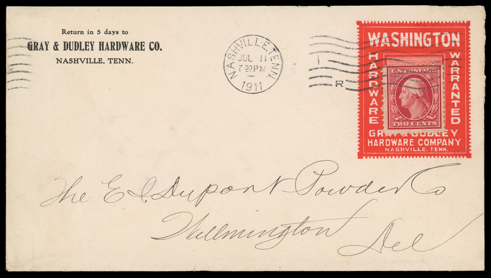 Washington Hardware Warranted, Gray & Dudley, Nashville, TN. Red advertising collar on cover bearing 2c carmine (375) tied by "Nashville, Tenn. Jul 11 1911" machine cancel to Willmington Del, Very Fine. Estimate; $100 - 150. (Image1)