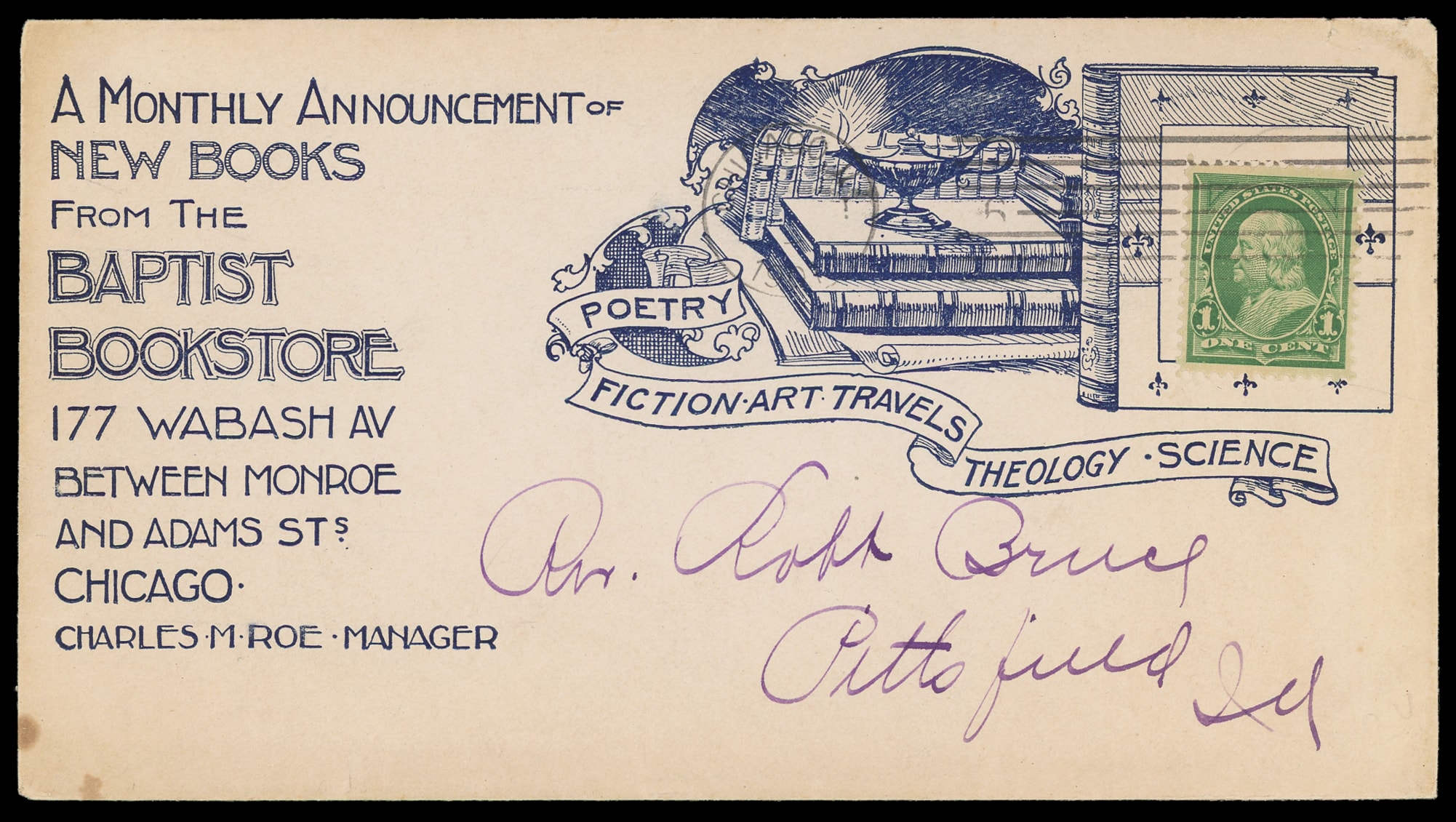 "Baptist Bookstore" Chicago, Ill. Blue illustrated advertising ornate collar on cover bearing 1¢ green (279) tied by "Chicago, Ill. 1901" machine cancel to Pittsfield Ind., attractive combination; trivial small corner stain lower left