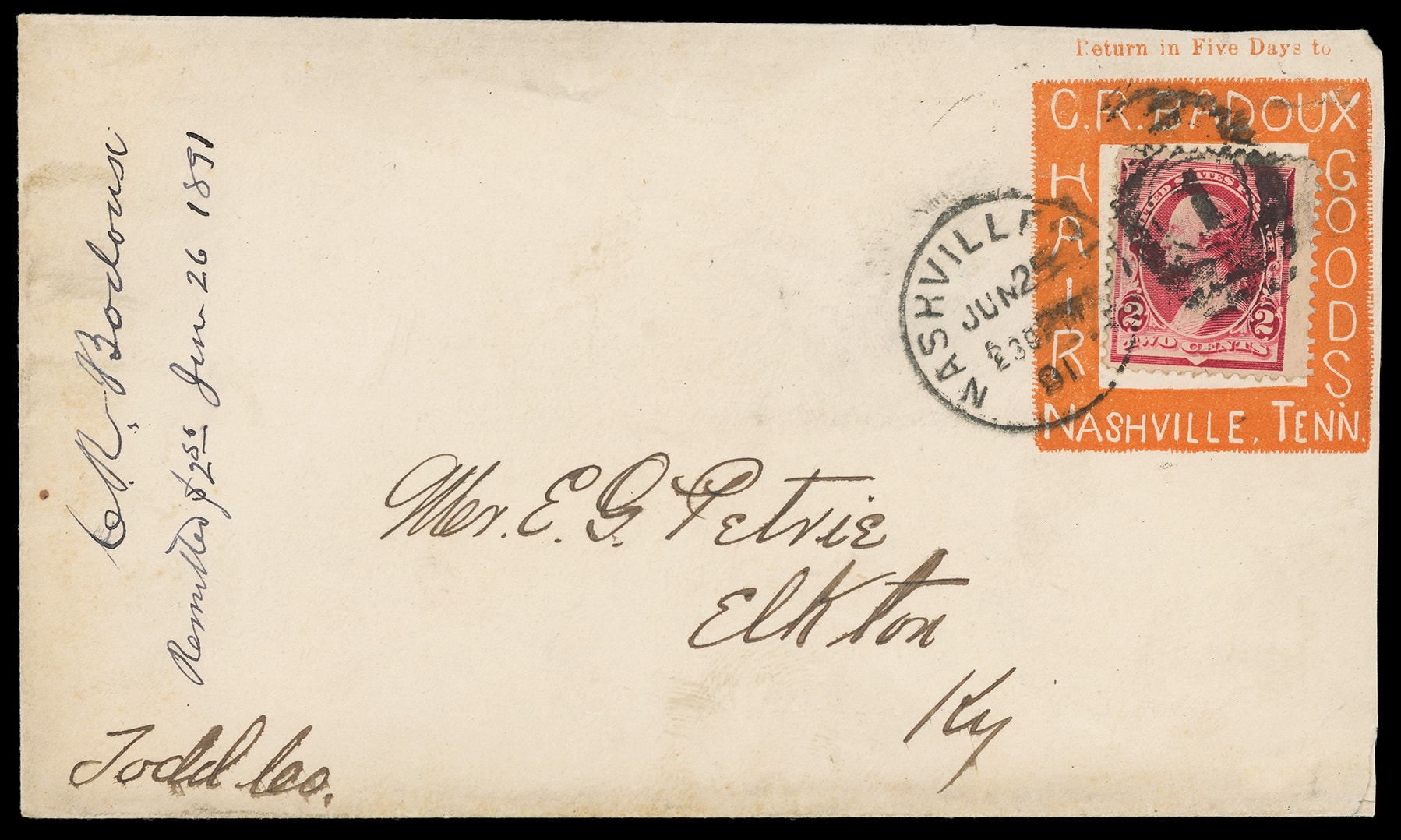"C.R. Badoux Hair Products, Nashville, Tenn". Orange advertising collar on cover bearing 2¢ carmine (220) tied by "Nashville, Tenn. Jun 25, 1891" duplex to Elkton, Ky; bit reduced at right and vertical docketing at left otherwise,