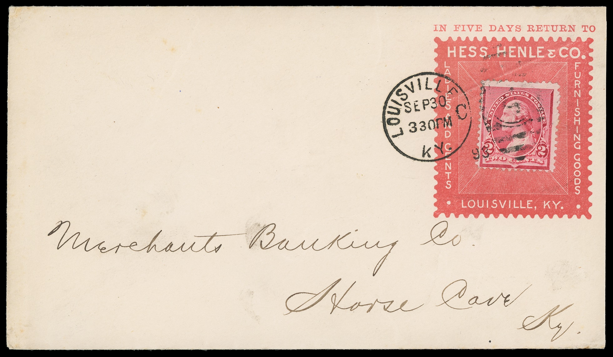 Henle & Co, Louisville, Ky. Large red stamp collar on cover bearing 2c carmine (220) tied by "Louisville, Ky. Sep 30, 1896" duplex to Horse Cave Ky; slightly reduced at right otherwise, Very Fine. Estimate; $150 - 200. (Image1)