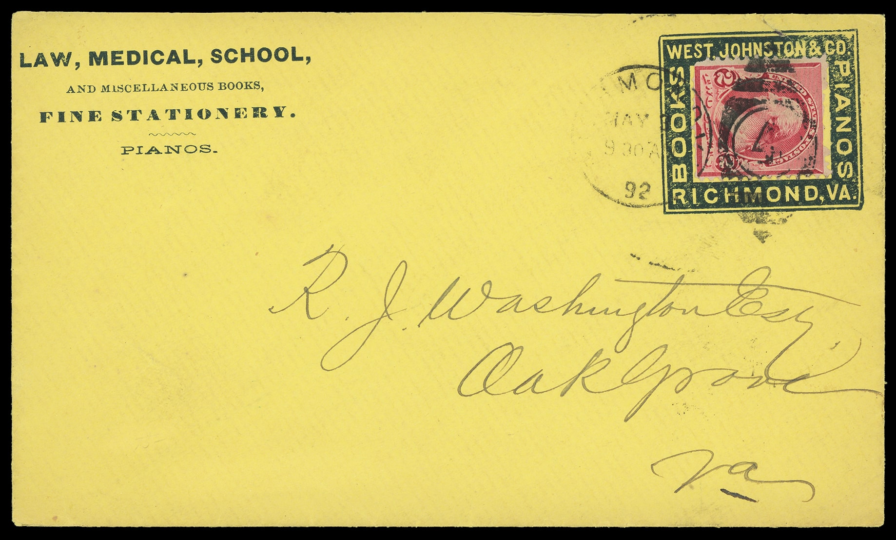 Merchandise) West, Johnston & Co, Books, Pianos, Richmond Va. Blue stamp advertising collar on yellow cover bearing 2¢ carmine (220) tied by "Richmond Va. May 3, 92" duplex to Oak Grove Va., Very Fine and colorful. Estimate; $100