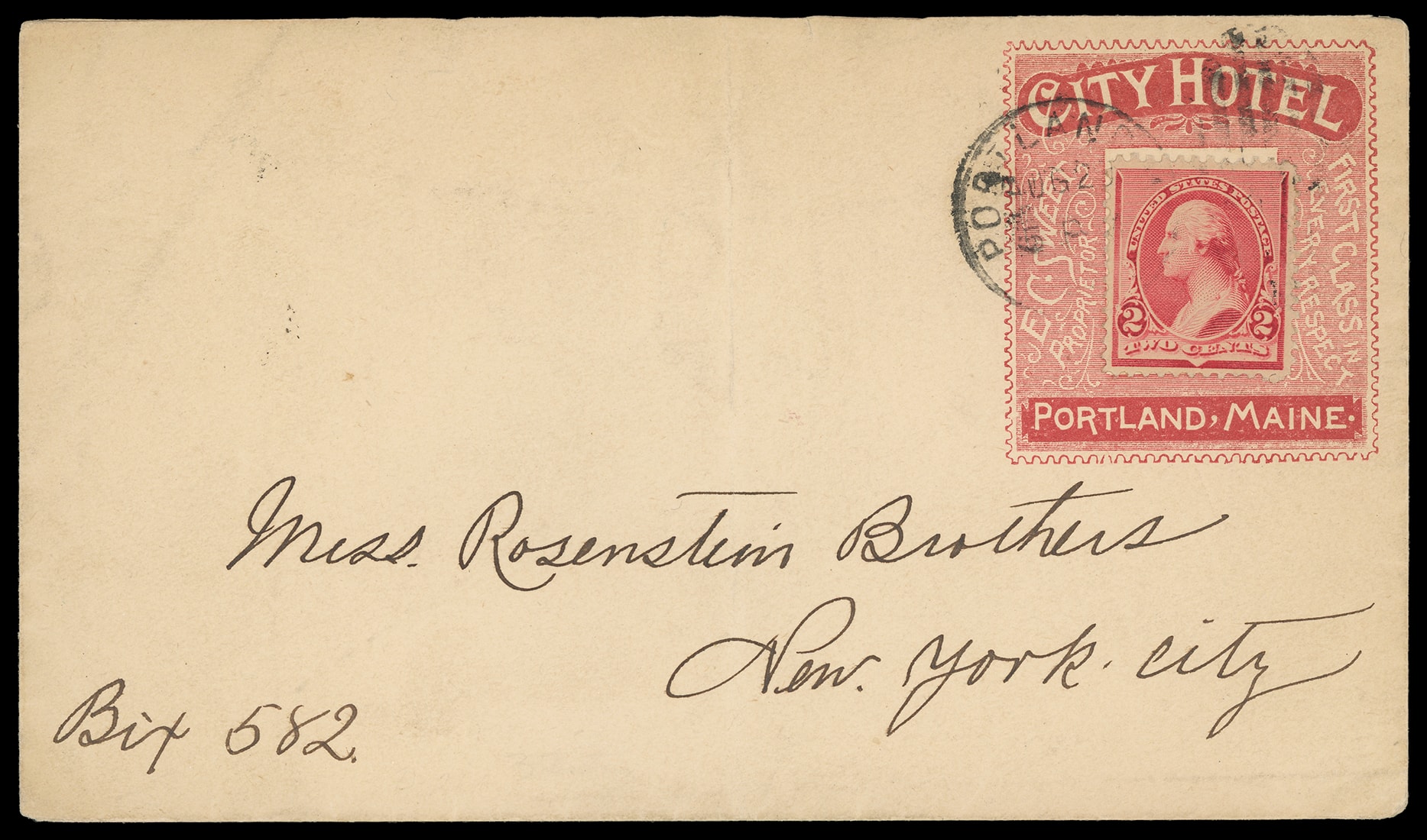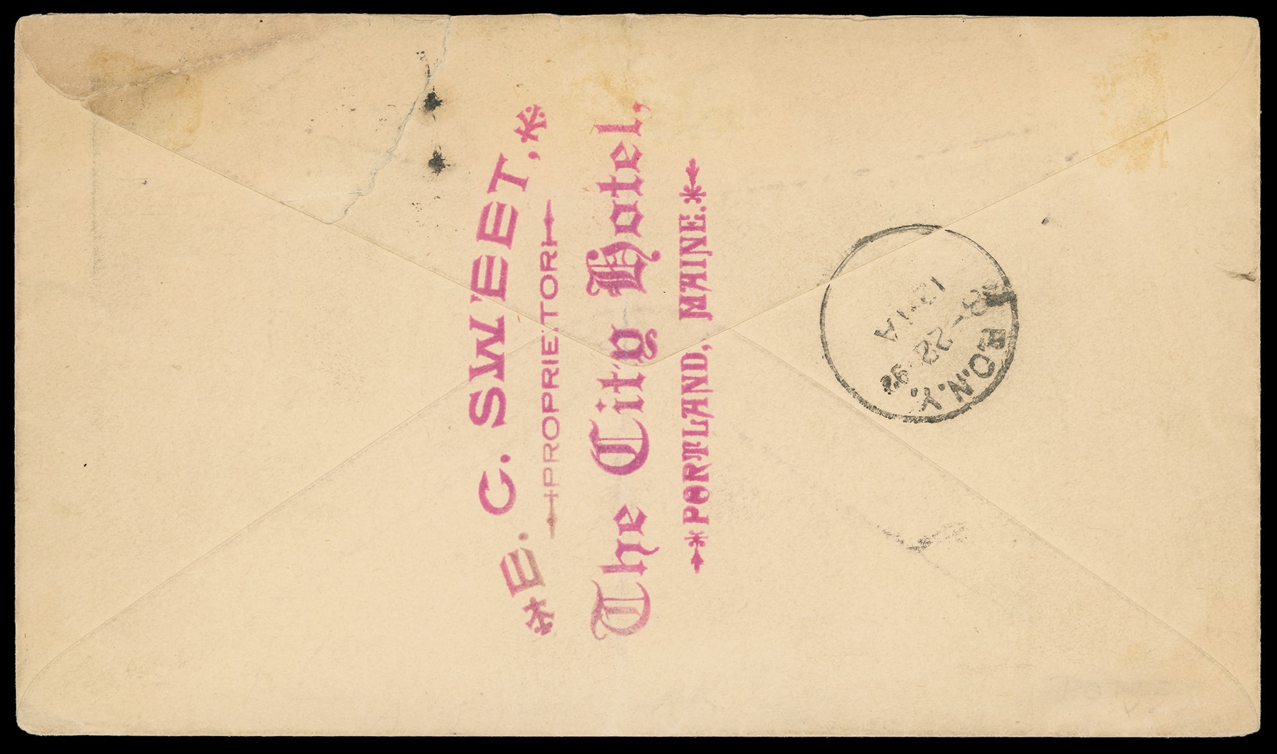 Hotel, Portland, Maine. Red illustrated advertising collar on cover bearing 2¢ carmine (220) tied by "Portland, Me. Aug 20, 1892" duplex to New York City, additional large magenta oval hotel backstamp "E.C. Sweet, Proprietor", Very Fine
