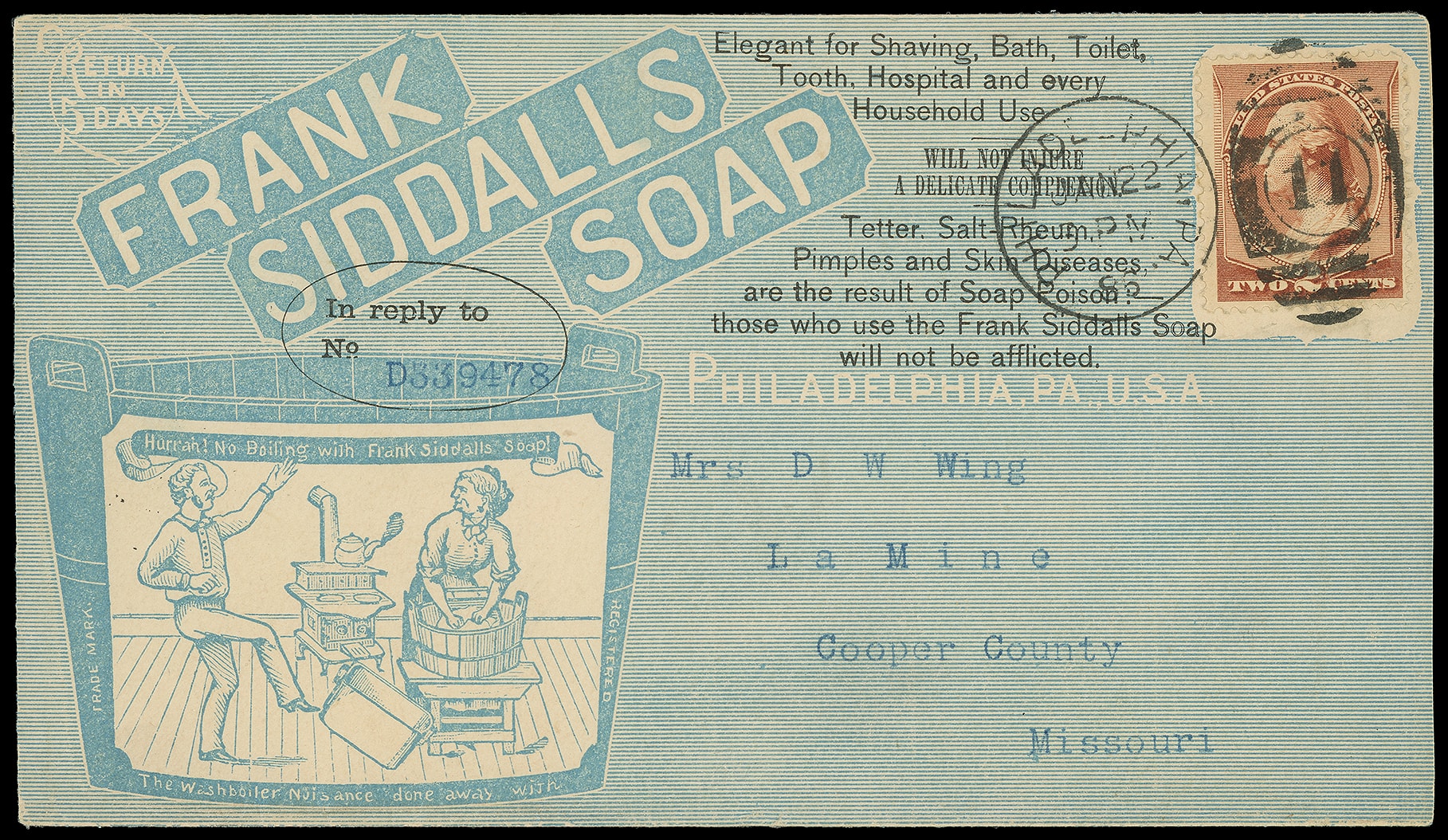 Frank Siddalls Soap, Philadelphia Pa. Overall illustrated blue design showing Woman Washing Scene with "Hurrah! No Boiling with Frank Siddalls Soap!" slogan on cover bearing 2¢ red brown (210) tied by "Philadelphia Pa. Jan 22 '86" duplex to
