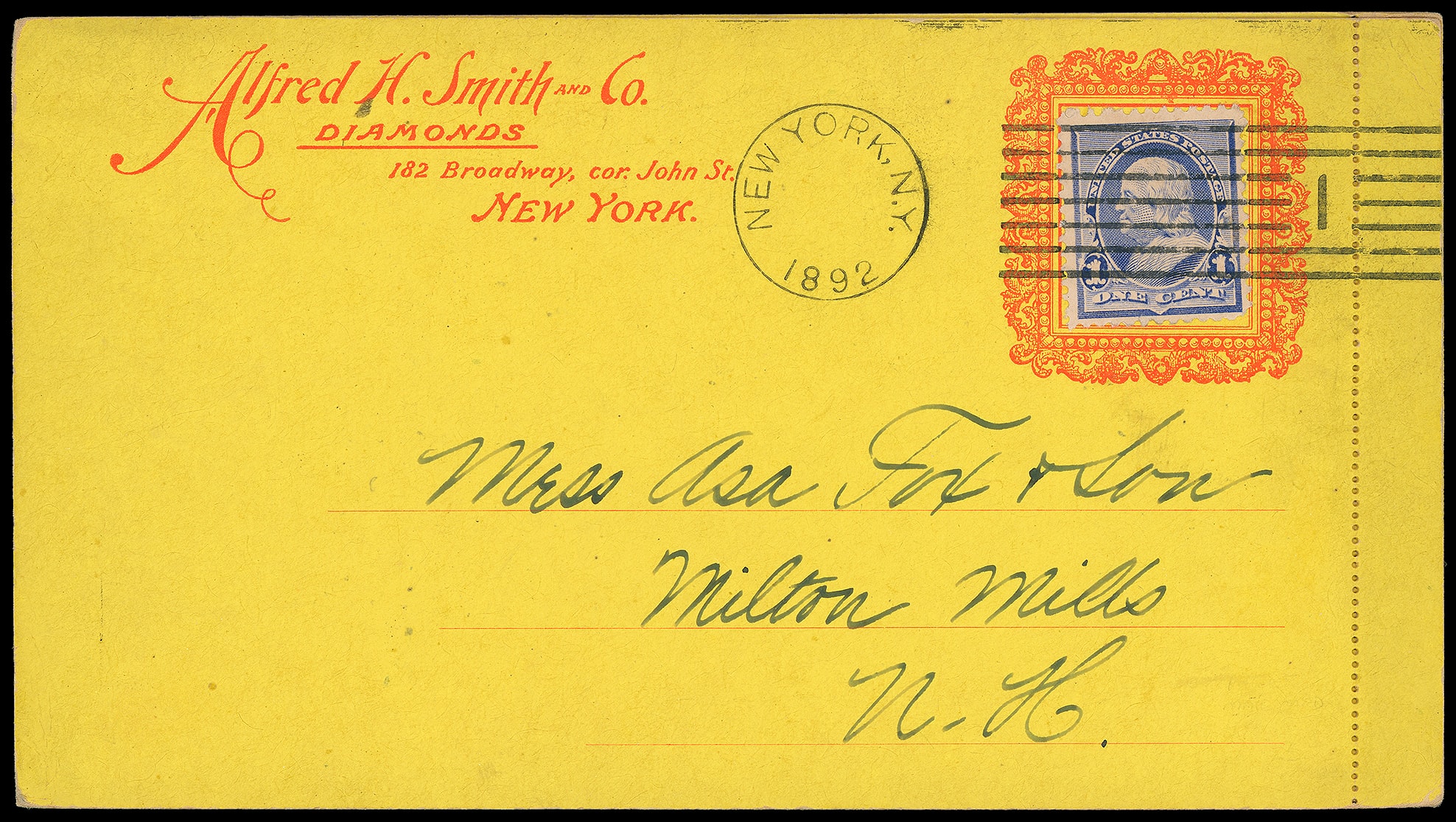 Smith & Co. Diamonds. Card lettersheet mailer with tab intact and fancy stamp frame bearing 1¢ blue (219) tied by dateless "New York, N.Y., 1892" machine cancel to Milton Mills N.H. Livermore & Knight imprint on reverse, Very Fine