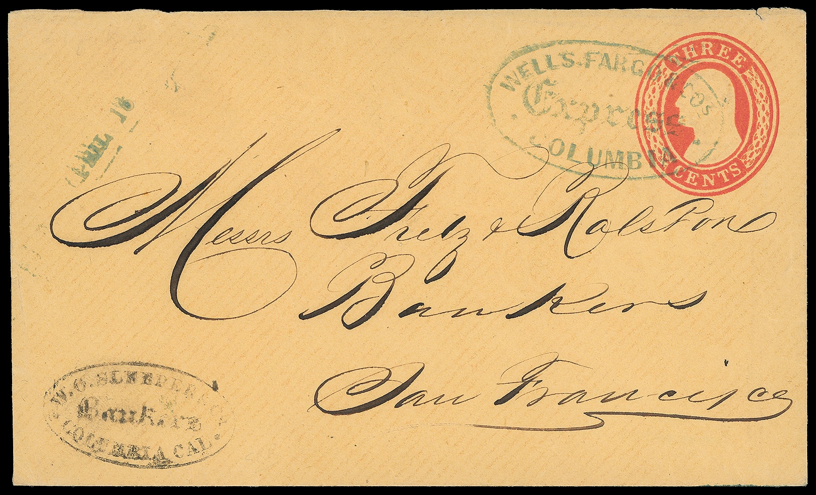 Co.'s Express, Columbia. Blue oval and matching small "April 15" straightline dater cancels 3¢ red (U10) buff Nesbitt entire with printed Wells Fargo frank to San Francisco Cal., black "W.C. Sleeper & Co. Bankers, Columbia, Cal." corner