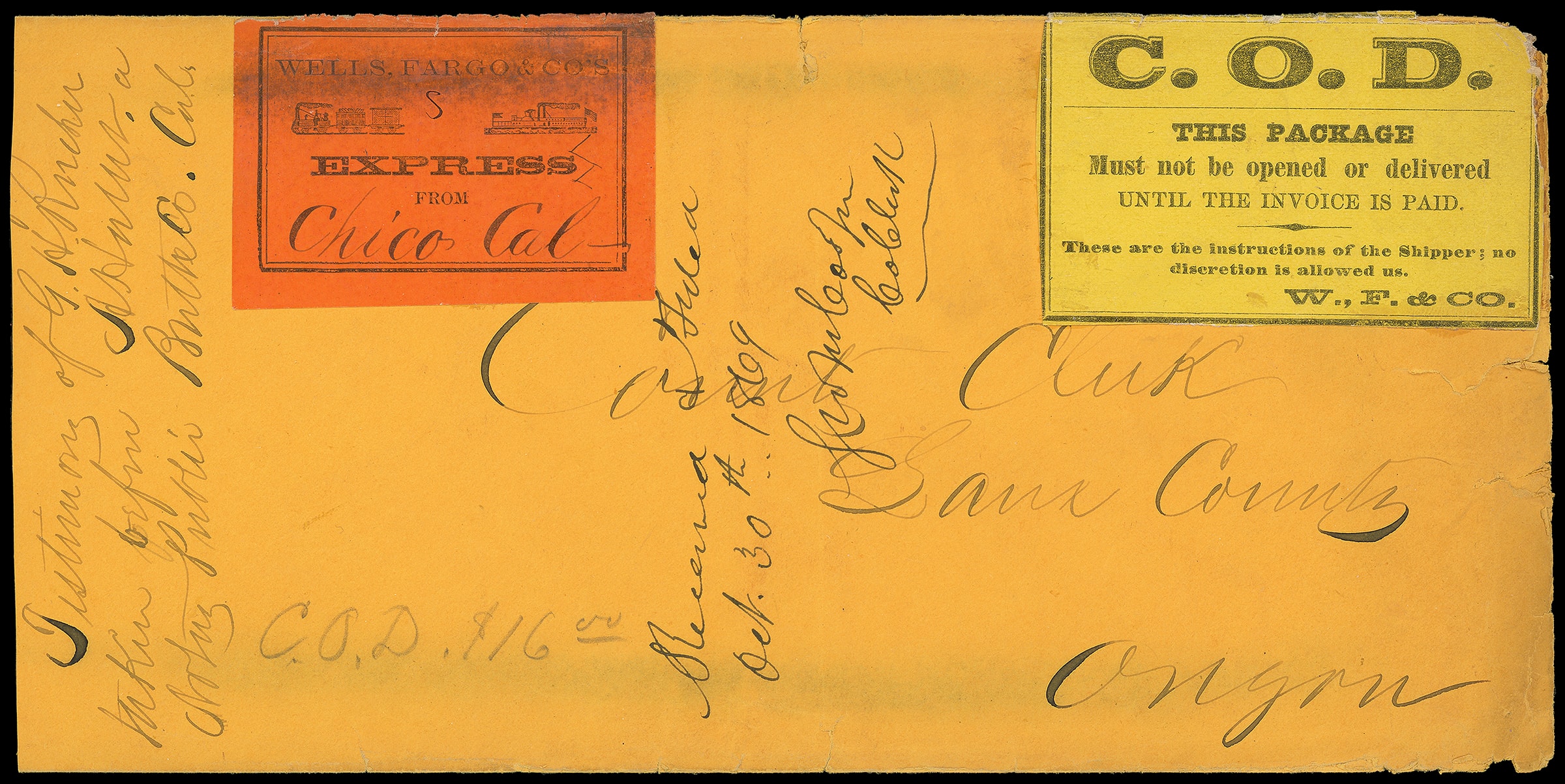 Express from Chico, Cal -. Orange label with "Chico Cal-" in manuscript, as well as second larger "C.O.D." yellow label of Wells Fargo on stampless orange legal size envelope to Lane County, Oregon; receipt docketing "Received &