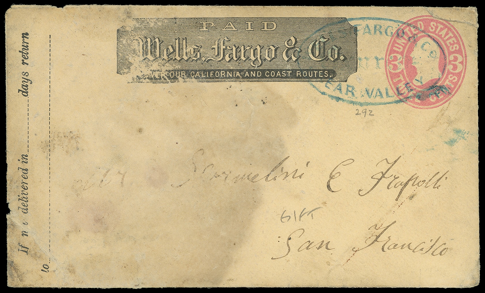 Express, Bear Valley. Blue company oval and printed Wells Fargo frank on 3¢ pink (U59) buff entire to San Francisco Cal.; heavy staining on left half of cover, repaired tear at top right just clear of indicia, Fine. Thomas No.