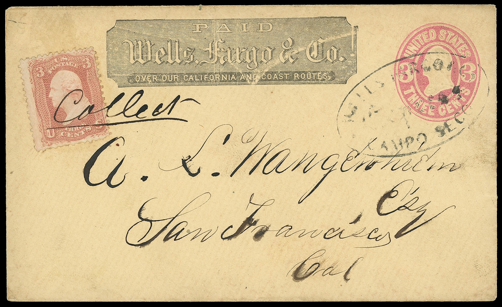 Express, Campo Seco. Black company oval and printed Wells Fargo frank on 3¢ pink (U58) entire to San Francisco Cal. uprated with 3¢ rose (65) tied by ms. "Collect" paying the double-rate, Very