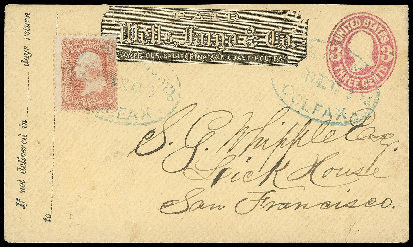 Express, Colfax. Blue company oval datestamp with printed Wells Fargo frank on 3¢ pink (U58) entire to San Francisco Cal. uprated with 3¢ rose (65) tied by second strike of company oval paying the double-rate; backflap torn and